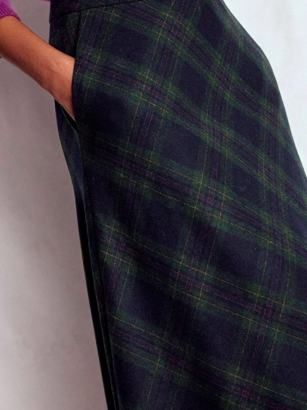 Our Hayley wool midi skirt is cut on the bias, which is a fancy way of saying it curves and drapes very nicely. With its seasonal check, it would do well with fine knits or elevated T-shirts on top, and a pair of knee-high boots underneath. Machine washable. 73% Wool, 25% Nylon, 1% Acrylic, 1% Polyester.
