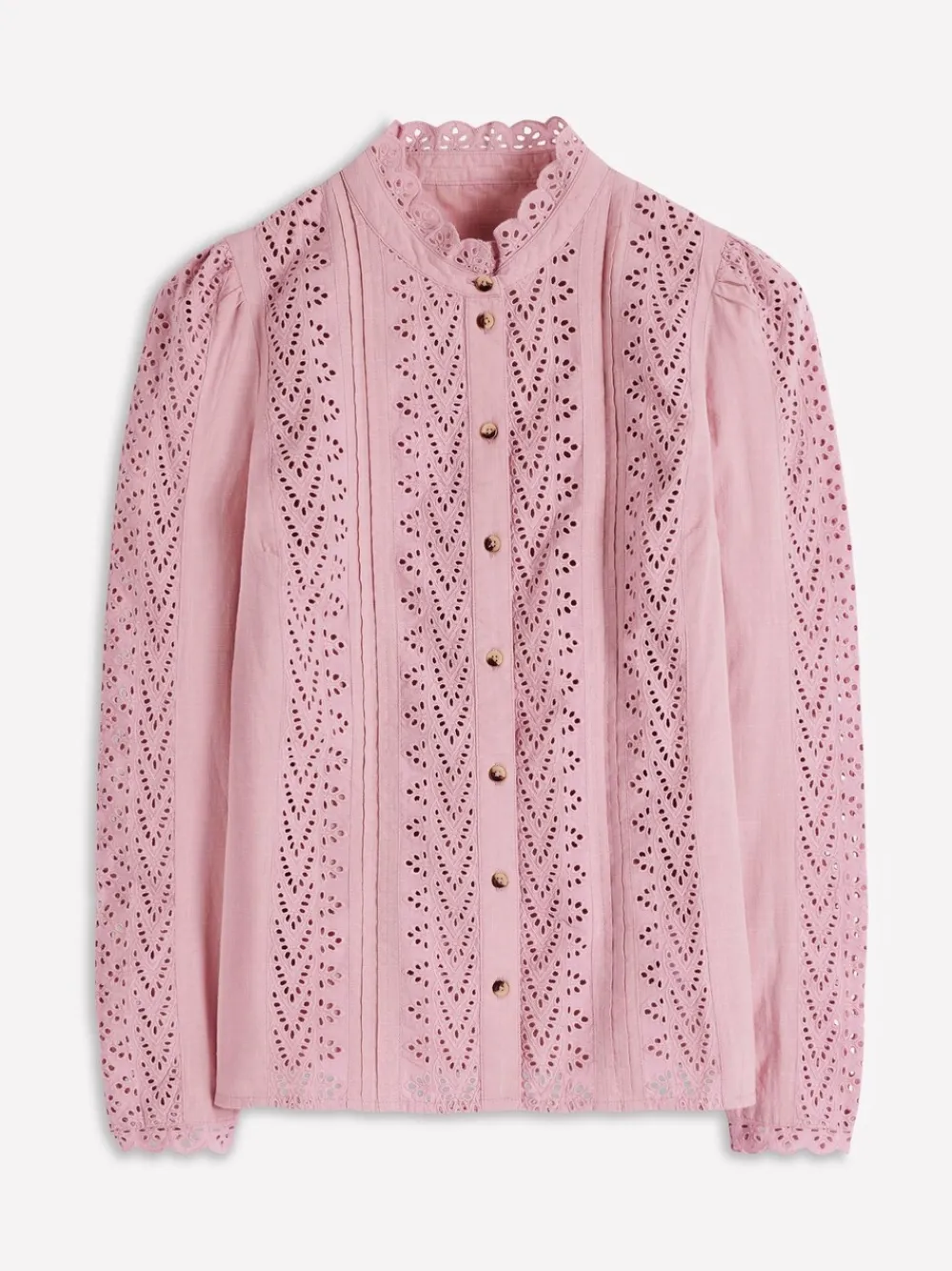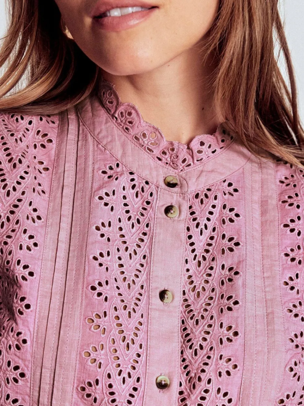 The ivory shade of our Savannah broderie top feels like the premium alternative to a plain T-shirt. With its intricate pintucks and standing pie-crust collar, it’s the perfect standalone pairing for jeans and trousers as well as layered underneath knits. Machine washable. 100% Cotton.