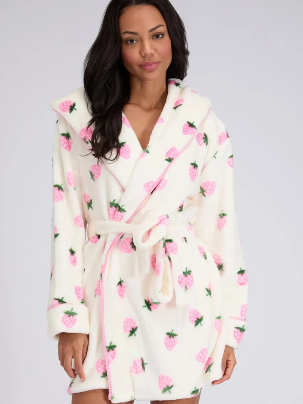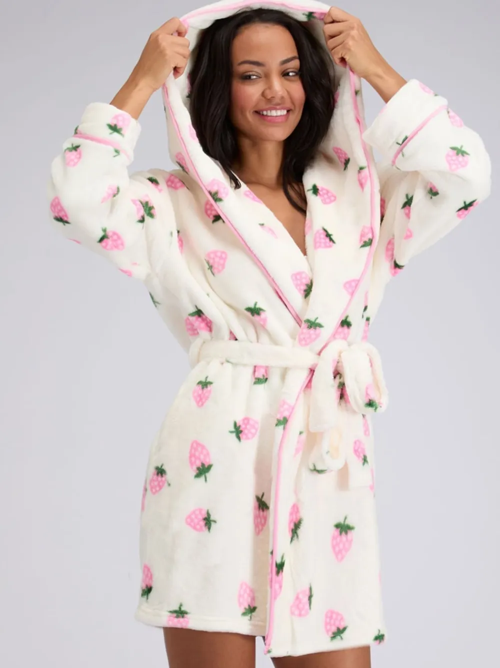 Stay sweet and snug in our fluffy strawberry short dressing gown—made from irresistibly soft fabric and finished with a charming strawberry print for head-to-toe comfort you ll want to pick every time. Silky-soft plush dressing gown. Sweet strawberry print. Pink contrast piping detail. Hood for added coziness. Belted with side pockets. Complete the look with our pyjamas and slippers! Machine washable. 100% Polyester.