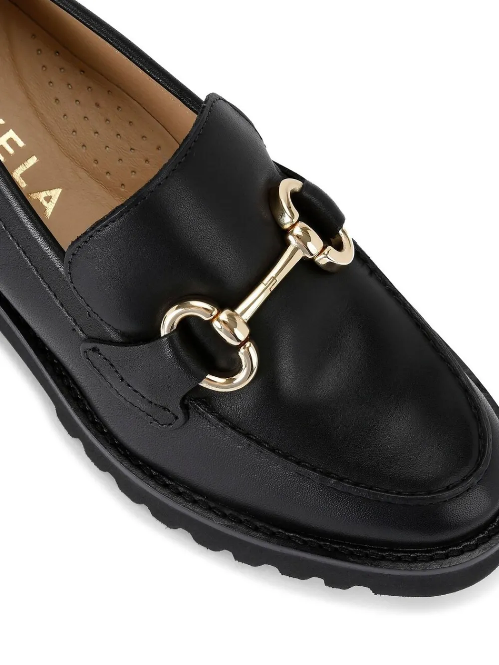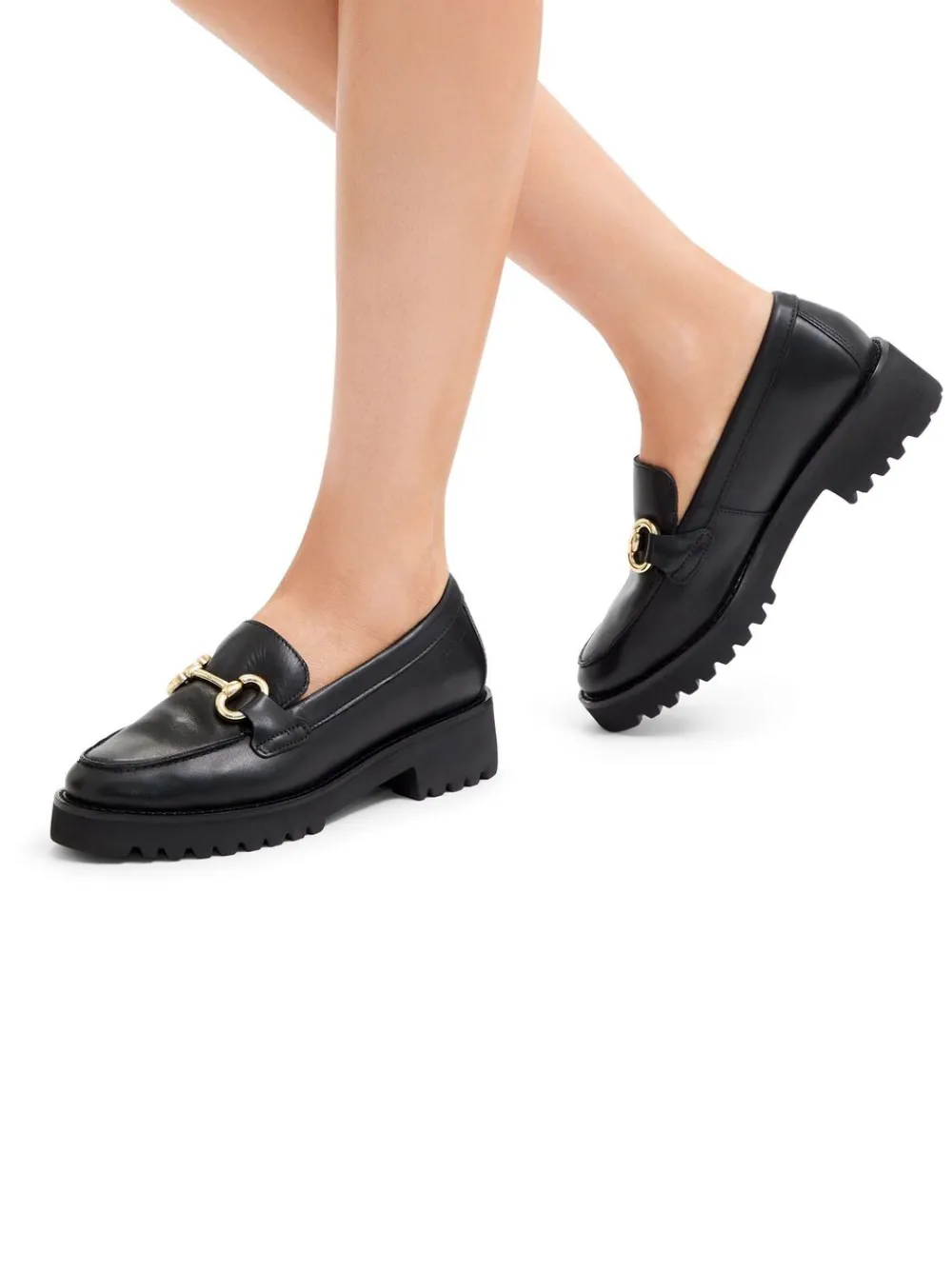 This Chester loafer features a black upper with gold tone horsebit chain detail across the toe. The sole is chunky in black. This product features All Day Long technology. Main – 100% Leather. Lining – 100% Other fibres. Sole – 100% Rubber.