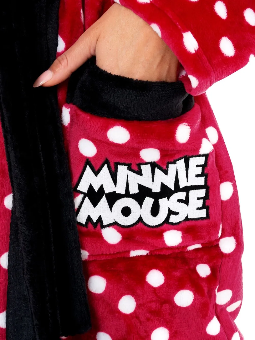 Bring back Disney to your cosy winter evening with this sumptuously soft Ladies Minnie Mouse robe. Featuring the classic Minnie polka dot and a tie belt fastening this is the perfect ladies dressing gown for cosy evenings. The luxurious soft fleece feel and cute Minnie design will cheer you up on even the gloomiest of winter evenings. For ultimate comfort this ladies Minnie bathrobe also has a hood. Machine washable. 100% Polyester. Warning: Keep away from fire and flames.