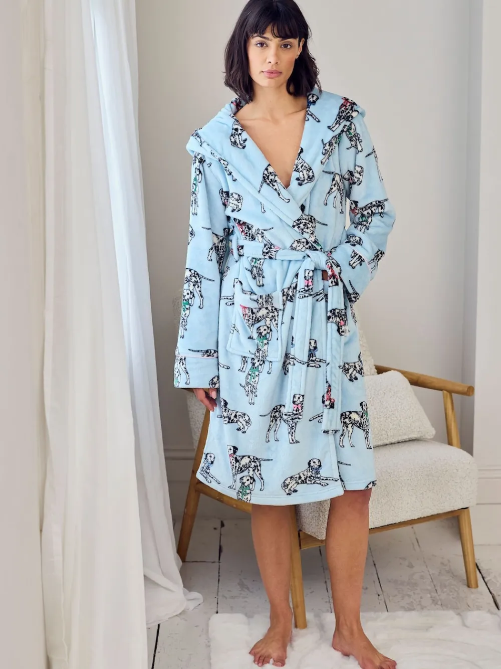 Spot something cosy? This plush fleece robe is all wrapped up in charm, thanks to a print of hand-drawn dalmatians wearing pastel ribbon bows. With a self-tie waist, generous hood and soft fleece, it’s the perfect throw-on for slow mornings, late-night lounging or walkies up to bed. Machine washable. 100% Recycled polyester.