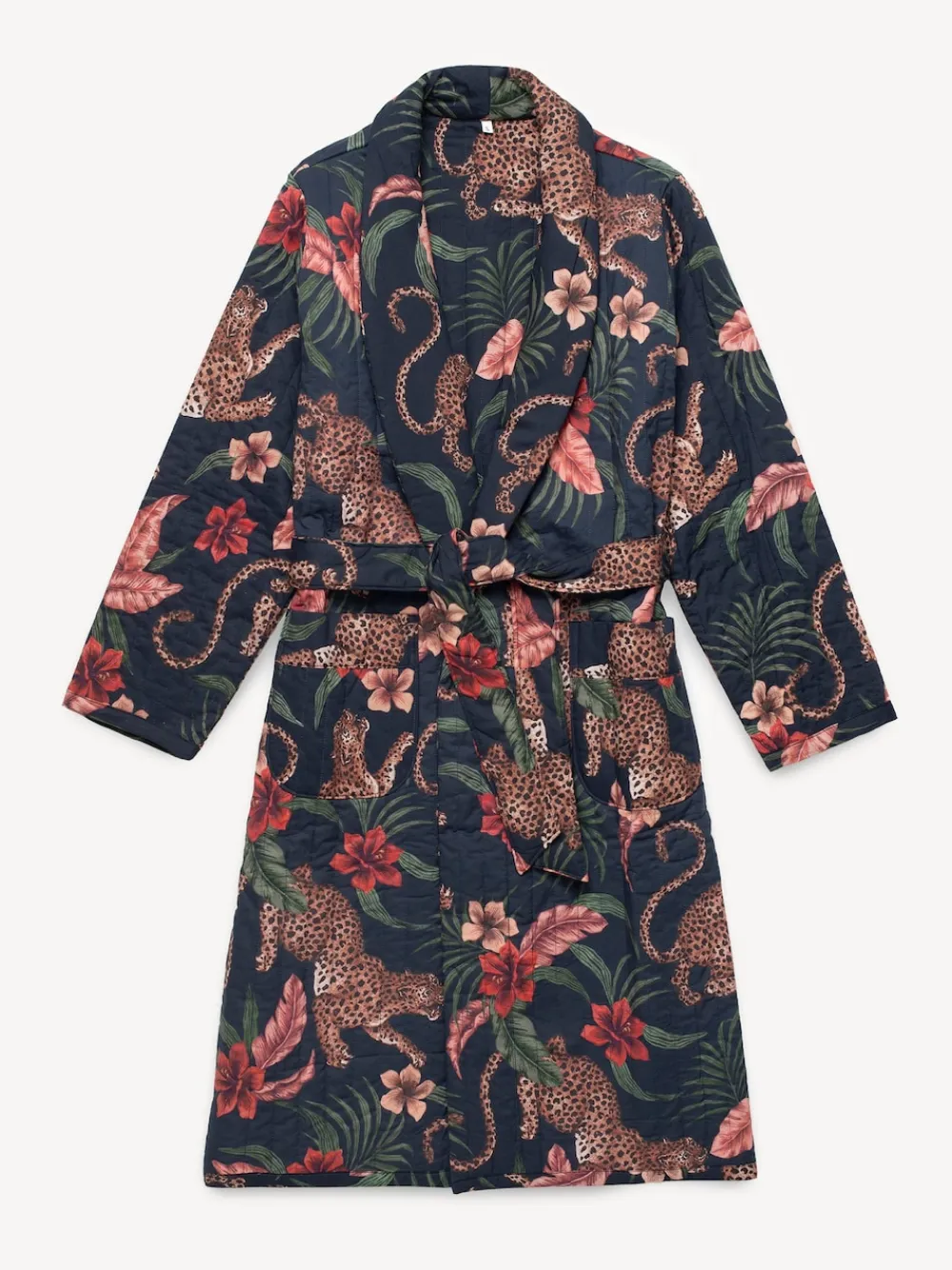 In a Sentence: This quilted robe is as opulent and enveloping as it looks Insulation-chic Sends a direct message to the brain to get cosy Stripe quilting has a slimming effect, without compromising on snugness We use it for the female robes Designed to feel like a duvet with a 100% cotton shell and polyester filling About the Print: A tribute to the lithe leopard, who dozes all day in the trees, then heads out to hunt in the moonlight. Painted in gouache Size Advice: Buy your usual size. 100% Cotton. Warning: Keep away from fire and flames.