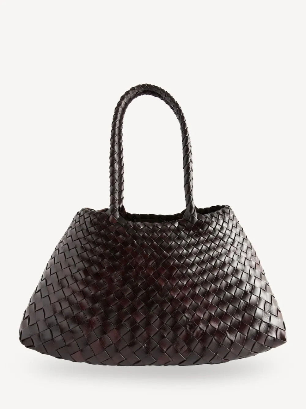 Crafted by expert weavers, the Santa Croce Big Bag in dark brown by Dragon Diffusion is revered by bag lovers everywhere. A striking cross-weave tapers towards the brim creating a statement silhouette. Handcrafted bag Cross-weave design Tapered to brim Unlined Height 44cm Width 23cm Depth 14cm 100% Leather.