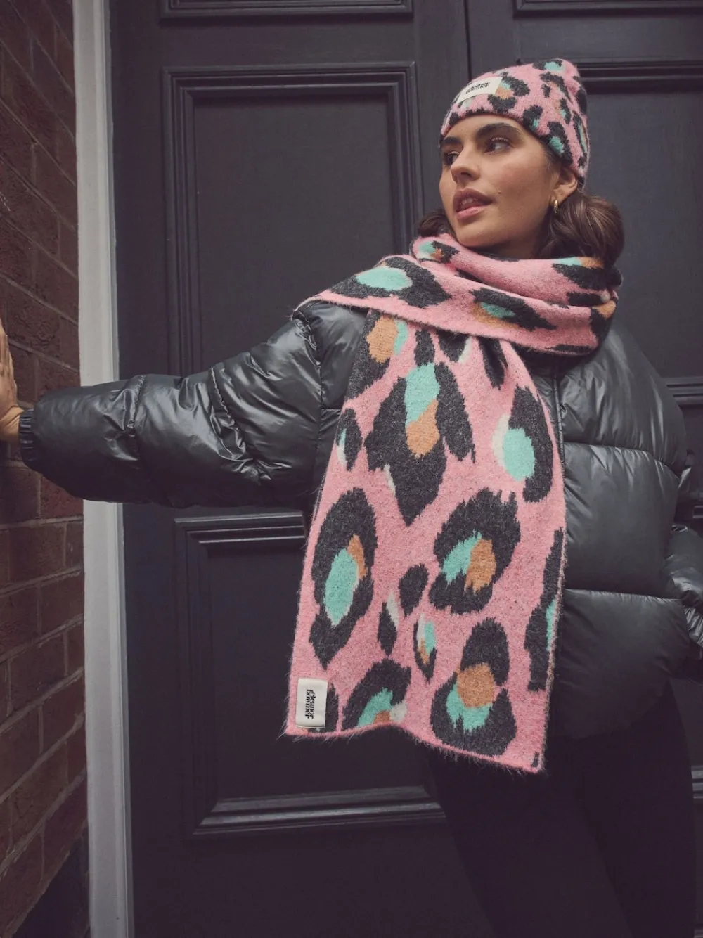 Exclusive to Next. Add a wild touch to your winter fits with this pink leopard print Eleanor Bowmer x NEXT chunky scarf. In a soft wool blend, this chunky knit scarf is ultra cosy and the perfect accent piece to complete your look. Featuring her iconic leopard print design, it’s finely finished with fun tassle ends and a branded label tab. Why not pair with the matching hat for a complete set. Chunky scarf Leopard print Eleanor Bowmer x NEXT collection Tassle ends Machine washable. 66% Acrylic, 13% Recycled polyester, 12% Nylon, 6% Wool, 3% Elastane.