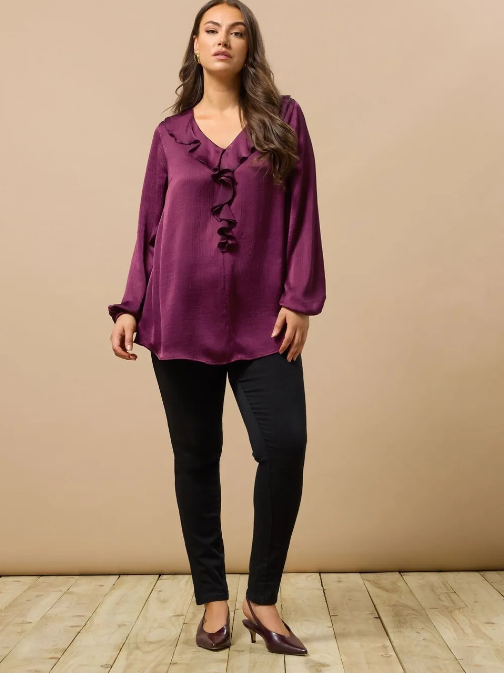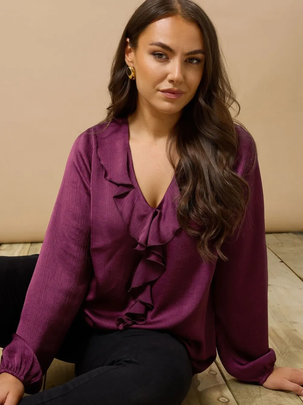 Fit & Fashion Notes: Refresh your blouse collection with this must-have blouse! Crafted from a lightweight woven fabric, this top undeniably breathable and luxuriously soft. Style with leather-coated trousers and heels – perfect for all your evening plans! Why We Love It: Your new go-to blouse! Features : V-neckline Long elasticated sleeves Finished with a frill neck trim Front detailing Machine washable. 100% Polyester.