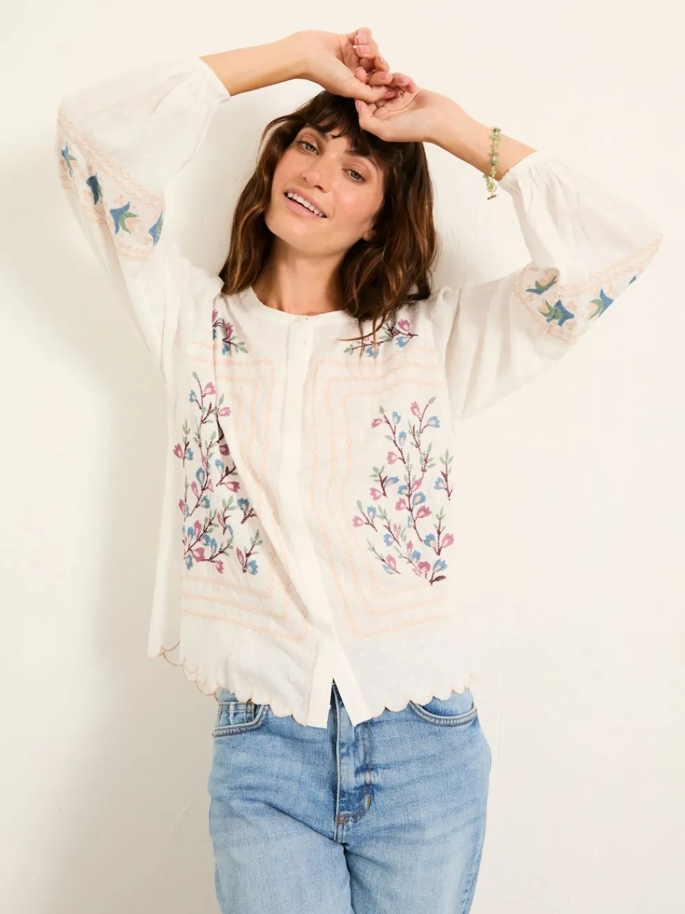 Our Betsie blouse features intricate floral embroidery across the front and sleeves. Crafted from soft and breathable fabric it has a relaxed silhouette, scalloped hem, and button-down front. A round neckline and cuffed sleeves complete the look with subtle polish. Perfect for weekday work fits to weekend plans. Machine washable. Main 100% Viscose. Embroidery 100% Polyester.