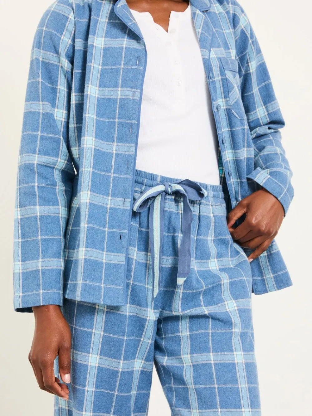 Sleep and relax in style with our check pyjama set. Supersoft and breathable, made out of a lovely 100% cotton , this is the perfect addition to those essential duvet days. With a loose fit and an elasticated waist, your comfort is our priority. This set includes a button down shirt and a pair of lightweight trousers. Machine washable. Main 99% Cotton, 1% Other fibres. Panel 100% Cotton. Trim 100% Cotton.