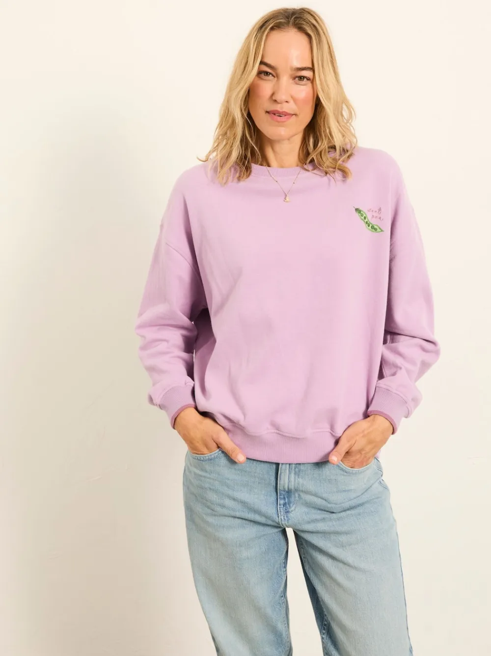 The Emily sweat pea crew sweat features a pea graphic that adds gentle charm to your everyday look. With a relaxed fit, soft fabric, and classic crew neckline, it’s perfect for layering on cooler days or throwing on for laid-back plans. Just add jeans or leggings for a casual feel. Machine washable. Body 89% Cotton, 11% Recycled polyester. Rib 98% Cotton, 2% Elastane.