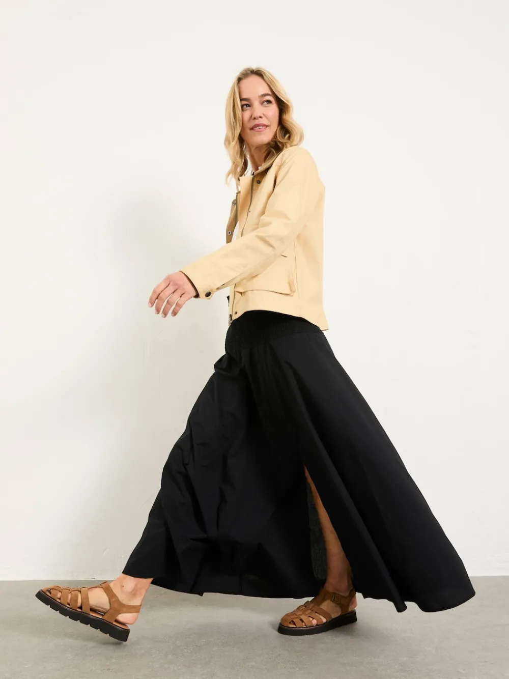 Our Harper maxi skirt features a shirred waistband that offers gentle stretch and a flattering fit, flowing into soft pleats that create effortless volume. Crafted from lightweight fabric, it drapes beautifully and feels comfortable all day long. Style with a fitted tee and sandals for warm-weather ease, or layer with a knit and boots as the seasons shift. Regular waistband to hem 37.5″ / 95cm. Machine washable. 100% Cotton.