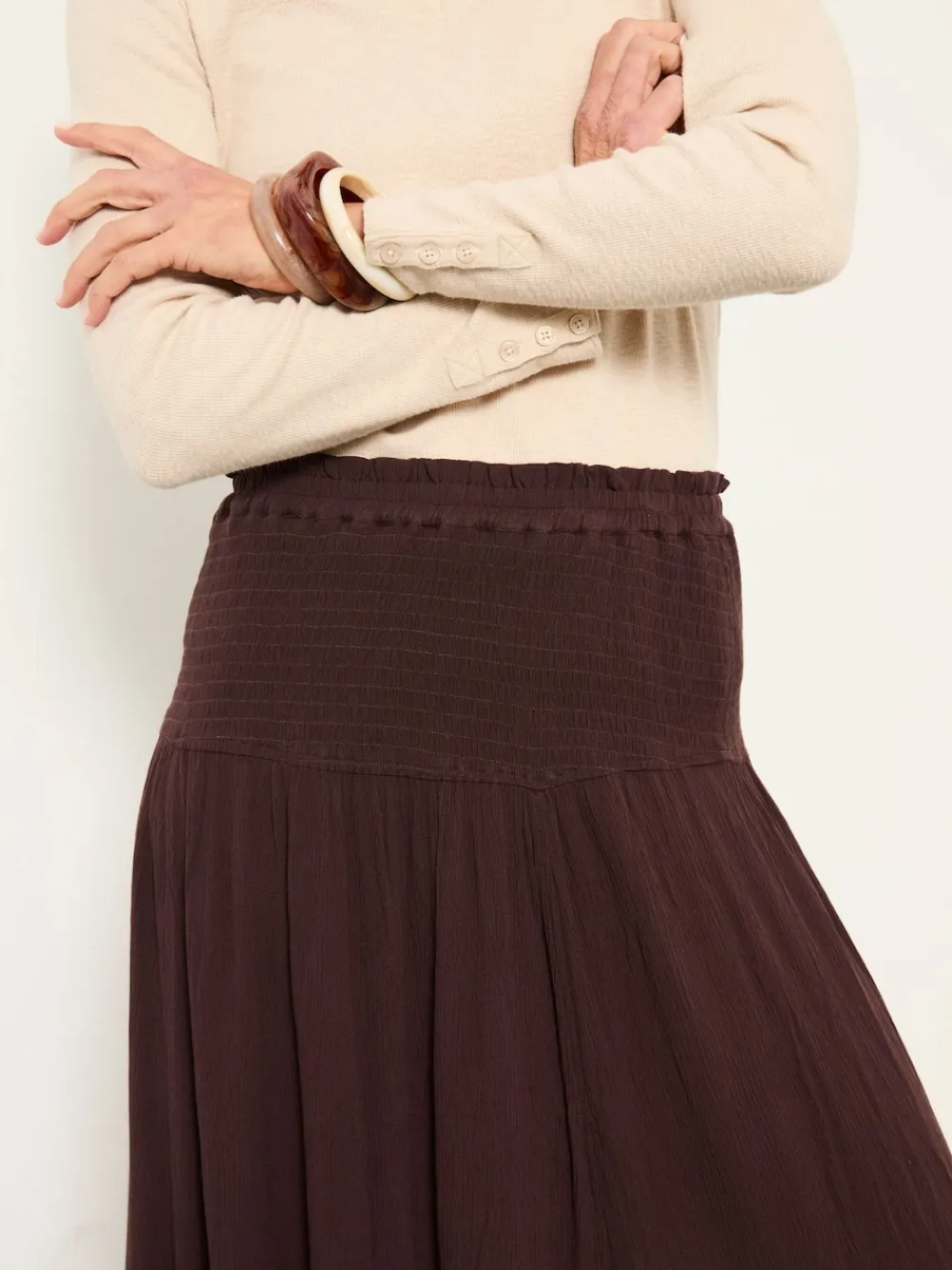 Our Harper maxi skirt features a shirred waistband that offers gentle stretch and a flattering fit, flowing into soft pleats that create effortless volume. Crafted from lightweight fabric, it drapes beautifully and feels comfortable all day long. Style with a fitted tee and sandals for warm-weather ease, or layer with a knit and boots as the seasons shift. Regular waistband to hem 37.5″ / 95cm. Machine washable. 100% LENZING™ ECOVERO™ Viscose.