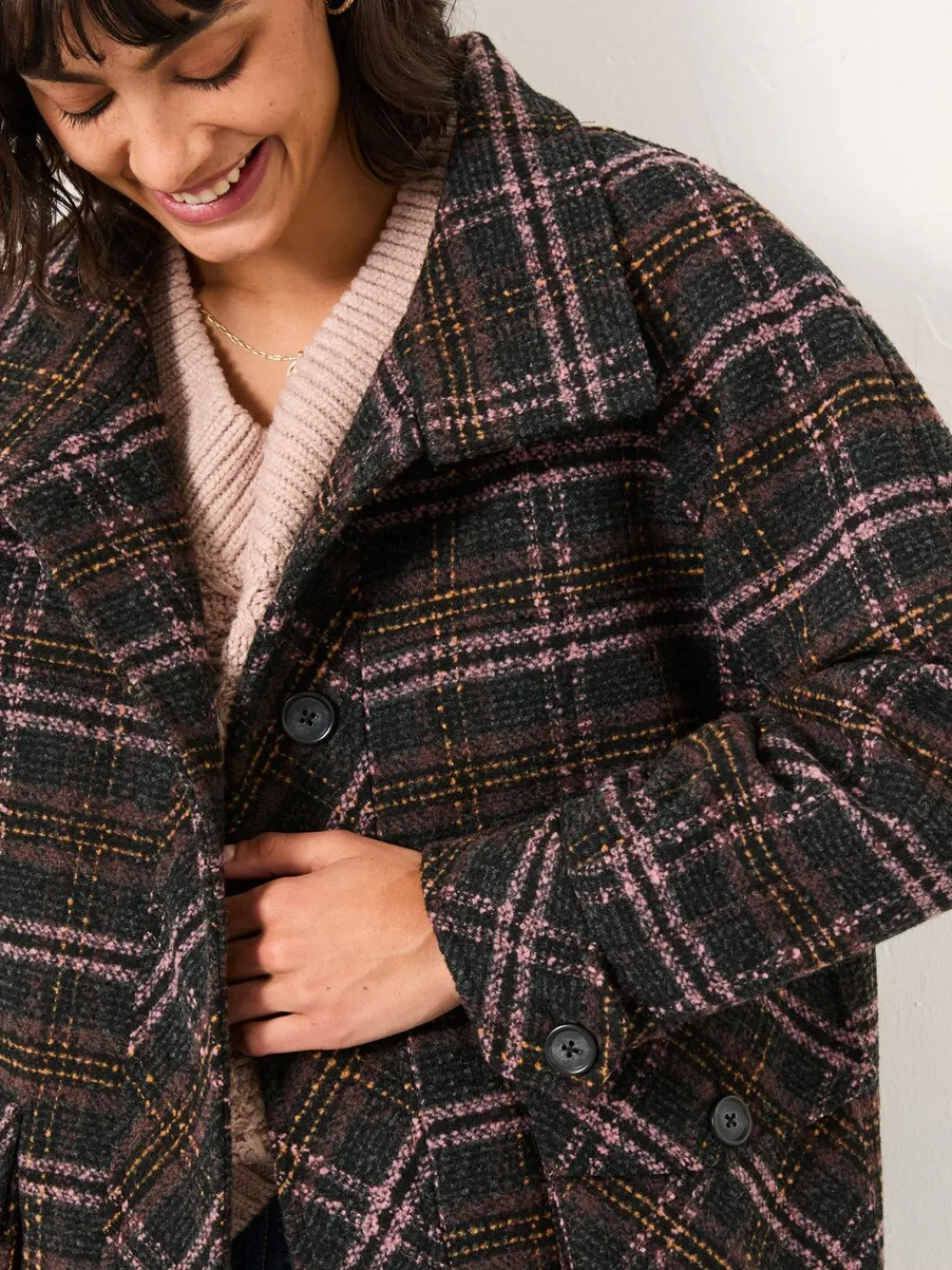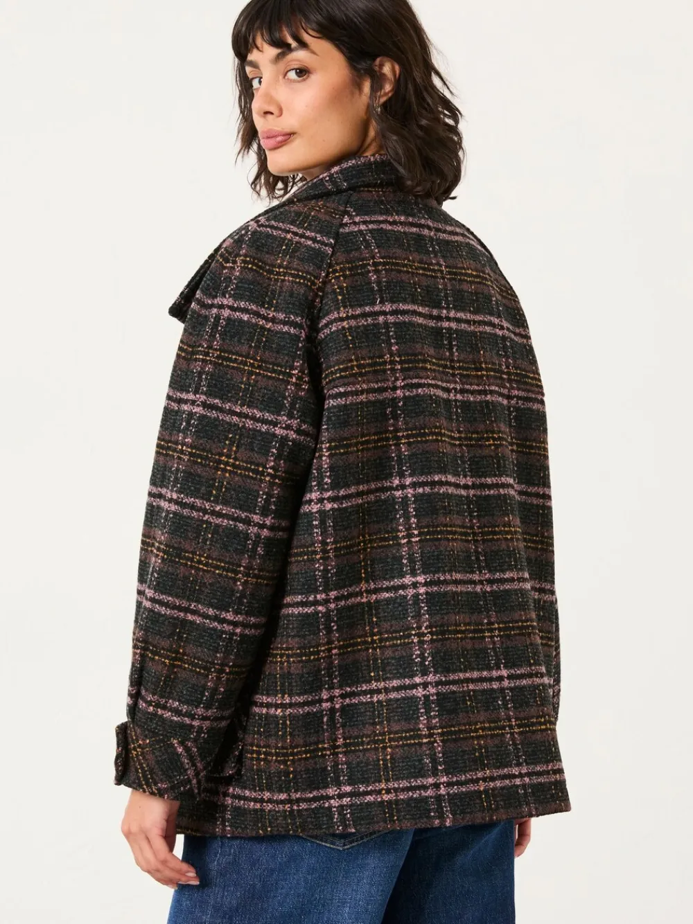 If you’re looking for a do-it-all jacket that’s warm, cosy and stylish, our Heather Check Coat is the one for you. The fabric is seriously toasty, the silhouette, shape and large collar is stylish and the pockets are roomy enough for stashing essentials as well as chilly hands. Dress up over a dress for weekend dinners or pair with jeans for casual weekday strolls. Regular centre back neck to hem 28.5″ / 72cm. Dry clean only. Shell 66% Recycled polyester, 34% Recycled wool. Body Lining 67% Recycled polyester, 33% Cotton. Sleeve Lining 100% Recycled polyester.