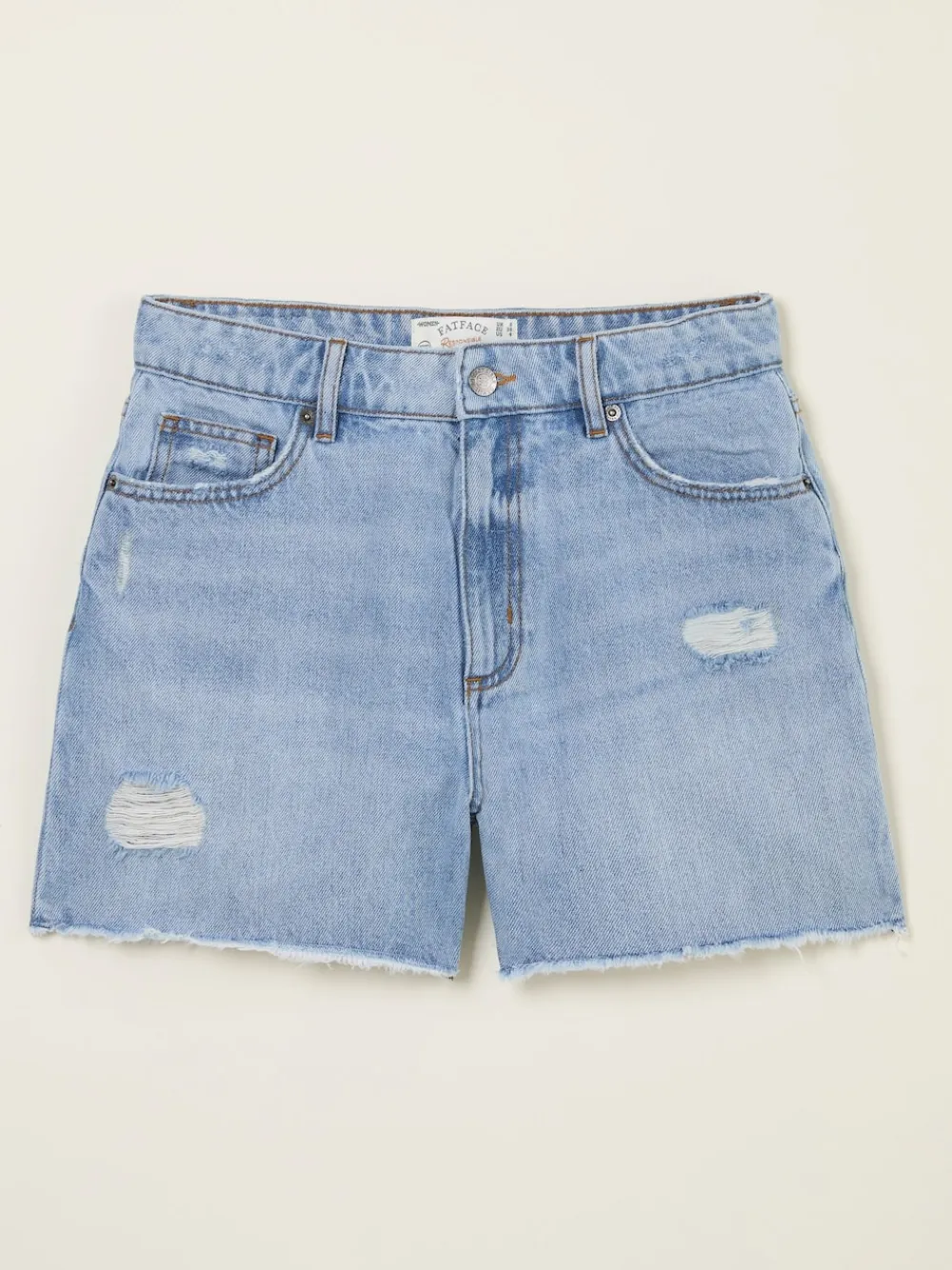 Our frayed denim shorts are your ultimate summer staple, with their distressed hem, light denim wash and easy fit. Perfect for festival nights, beach strolls, or summer holidays, they pair effortlessly with a bikini top, a breezy blouse, or your favourite tee. Model is 5’9”/175cm and wears UK size 8 Regular inside leg length 4″ / 10cm. Machine washable. 80% Cotton, 20% Recycled cotton.
