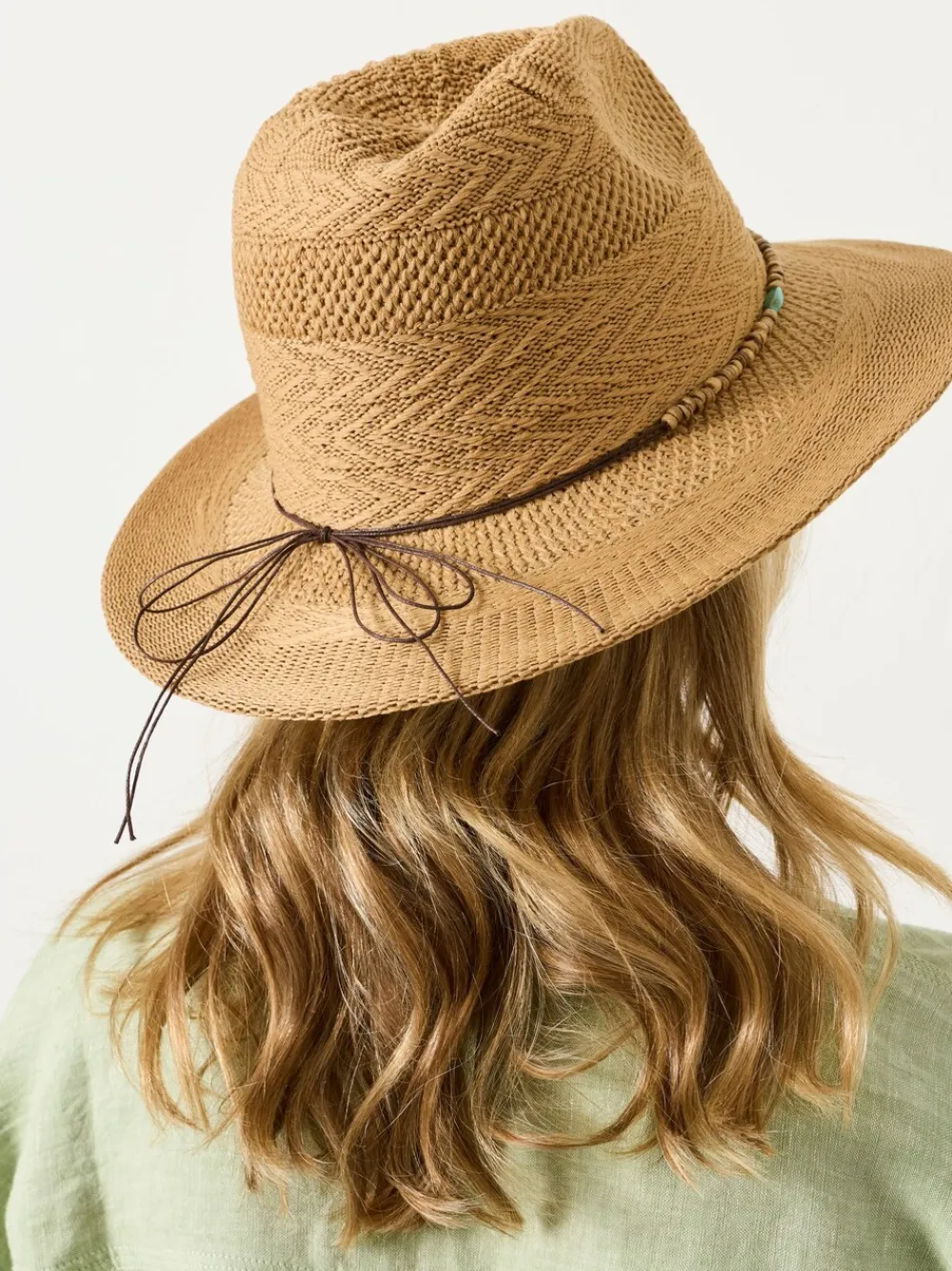 Our fedora features a classic shape with a beaded trim for a subtle pop of texture. Lightweight and comfortable – perfect for sunny days, weekend plans, or adding something extra to your everyday look. Do not wash. 100% Recycled polyester.