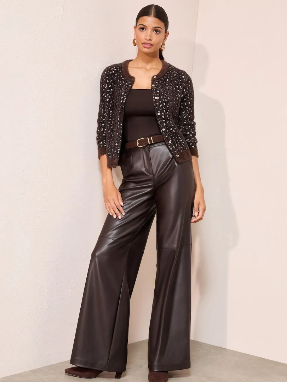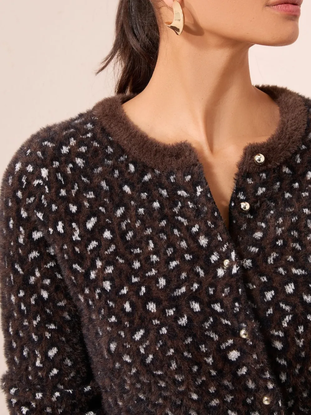Get ready for winter with our gorgeous eyelash knits. Featuring styling gold dome buttons on an incredible soft yarn. Paired best with denim for a day to night look. Featuring. Eyelash yarn. Gold dome buttons. Animal print. Crew neck. Long sleeve. 86% Nylon, 8% Viscose, 6% Polyester.