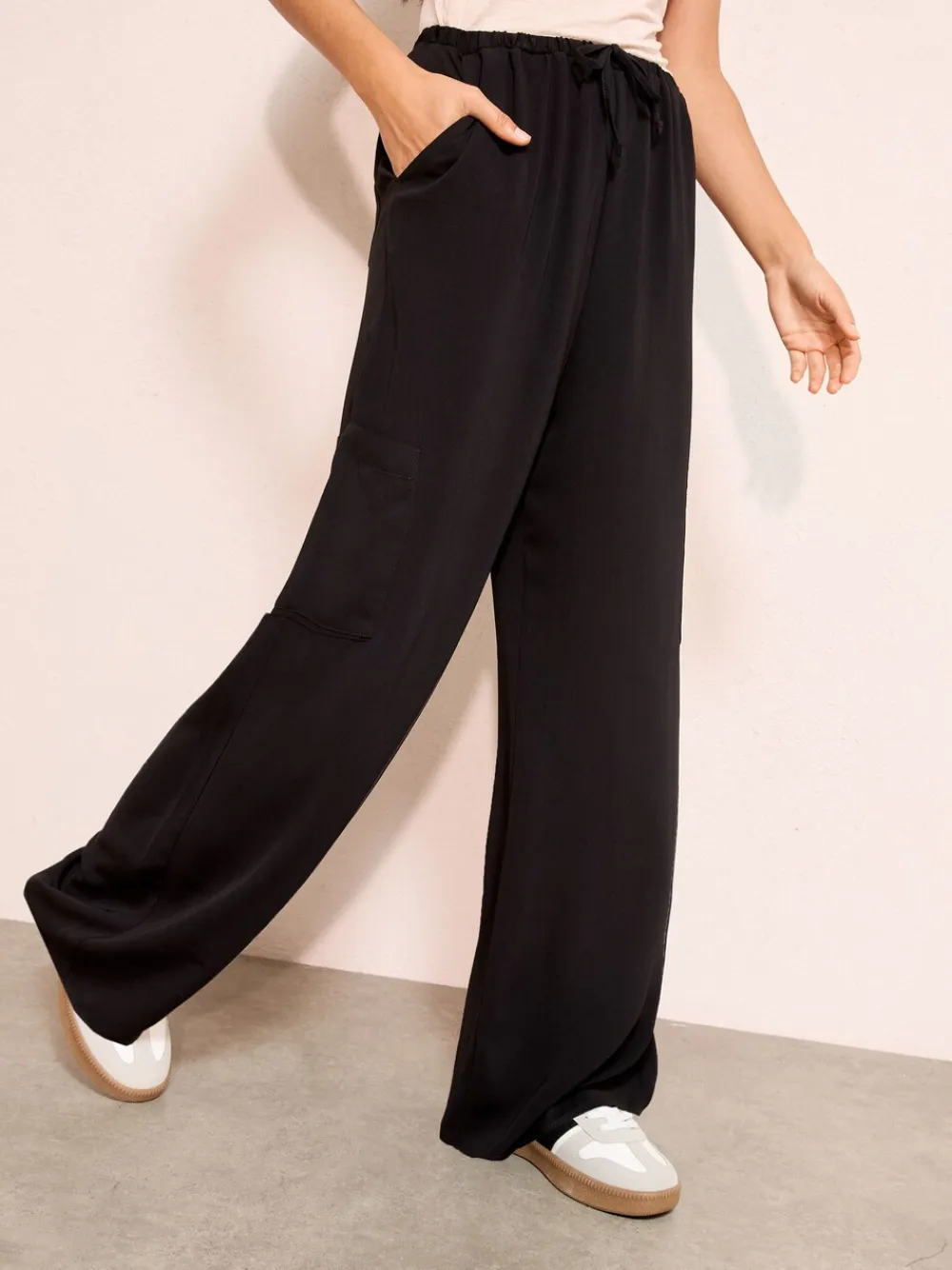 Wide Leg, Elasticated tie waist, Utility Pockets, back pockets, gorgeous comfortable fabric, can pair with a blazer for a sleek look or trainer and knit for comfort, shop in both petite and regular length. Model wearing Size 8. Main 100% Polyester. Lining 100% Polyester.