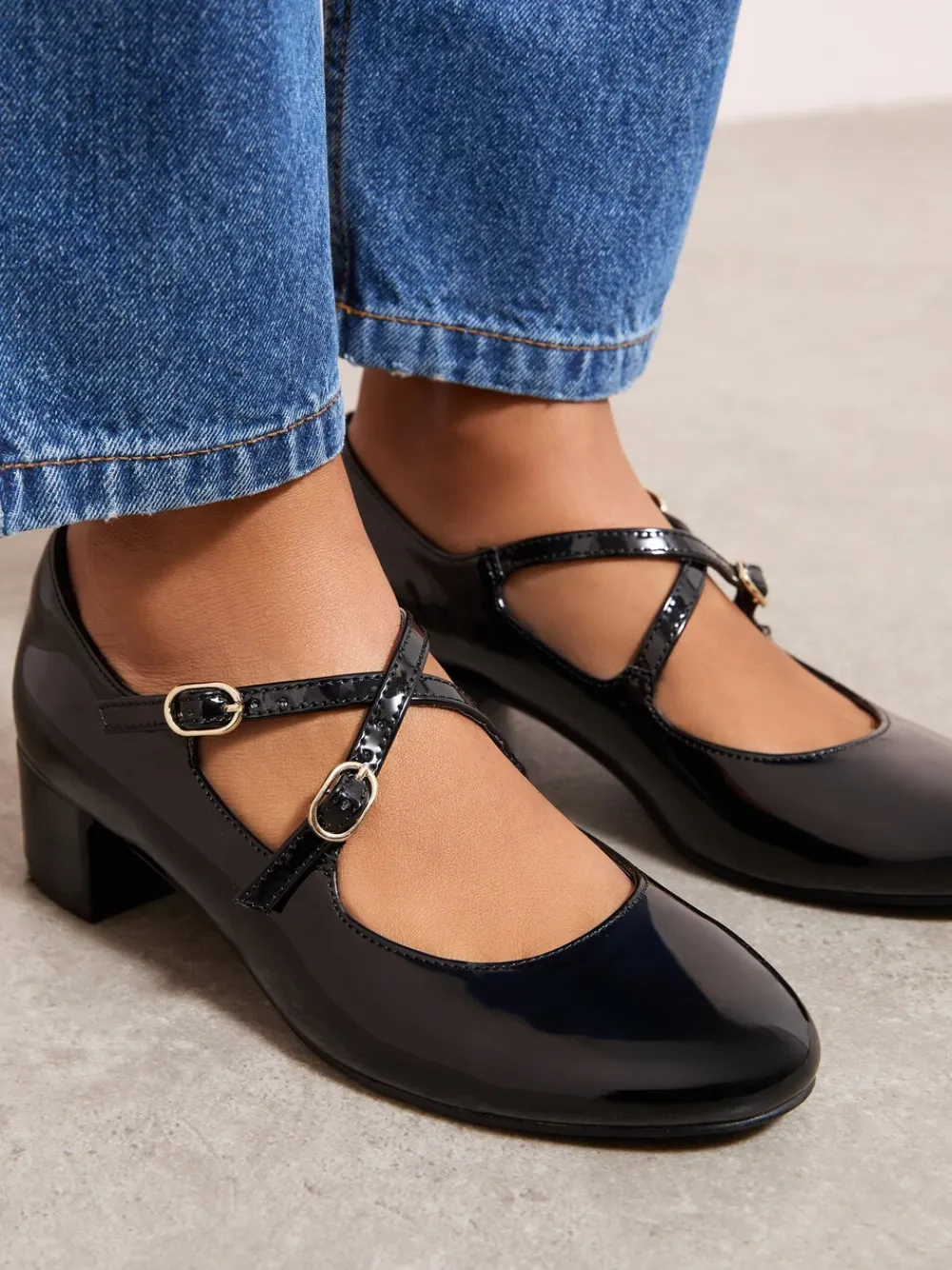 This classic design is enhanced with two slim, buckled straps that cross over the arch of the foot, adding a sophisticated detail. A low, block heel offers a comfortable lift, making them ideal for both everyday wear and special occasions.Featuring- Faux leather patent finish- Ideal for work or smartwear- Low block heel – Cross over strap design with buckle fastening- Heel height: 4cm Upper – Other Materials, Lining & Sock – Other Materials, Textile, Sole – Other Materials.