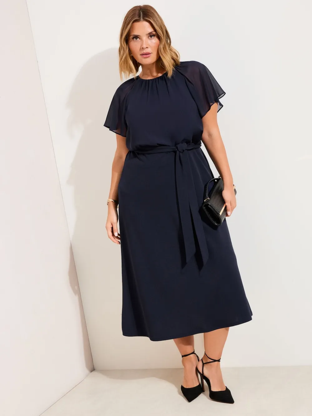 Friends Like These Curve Scuba Chiffon Flutter Sleeve Midi Dress Navy Blue Outlet