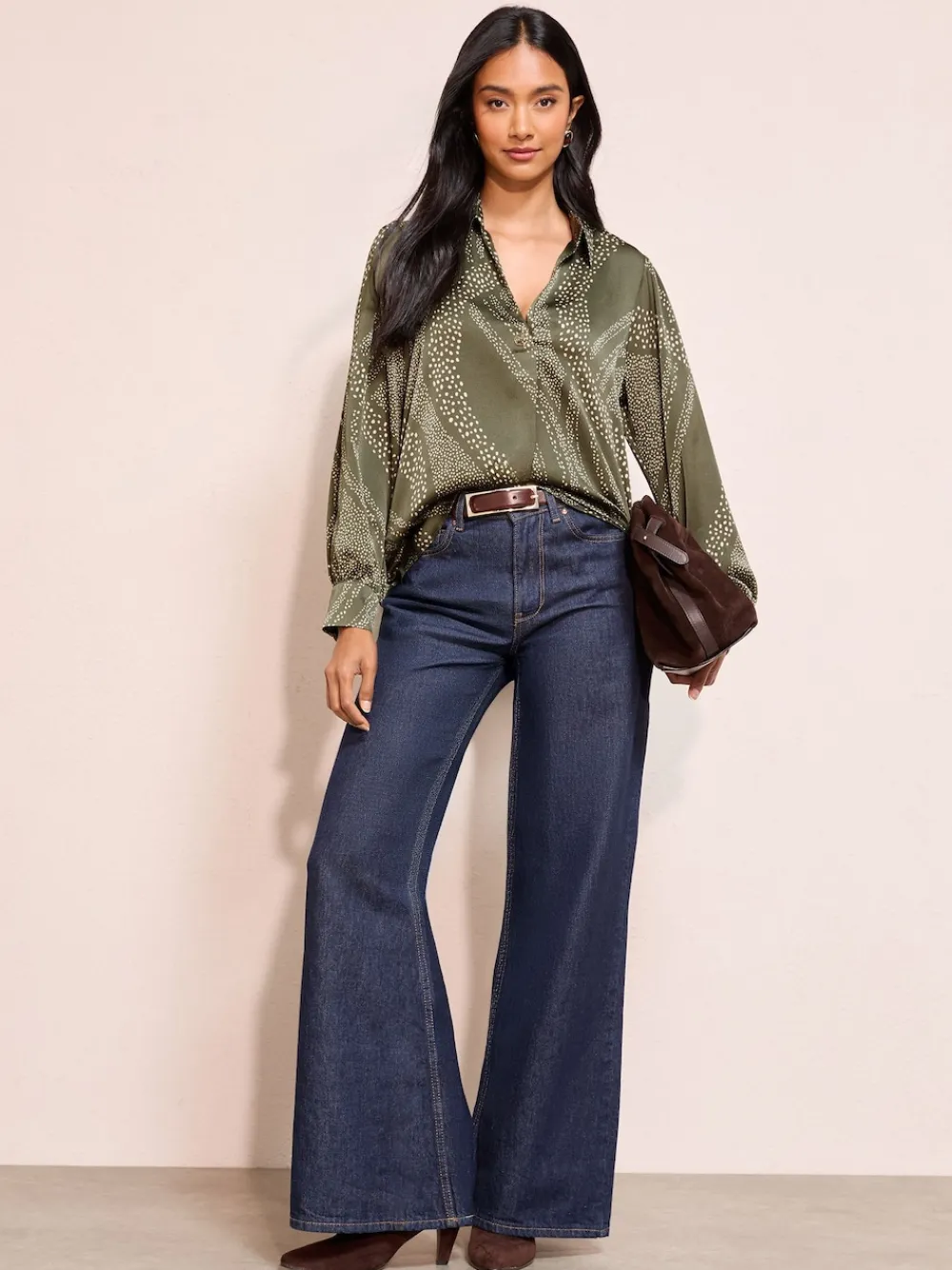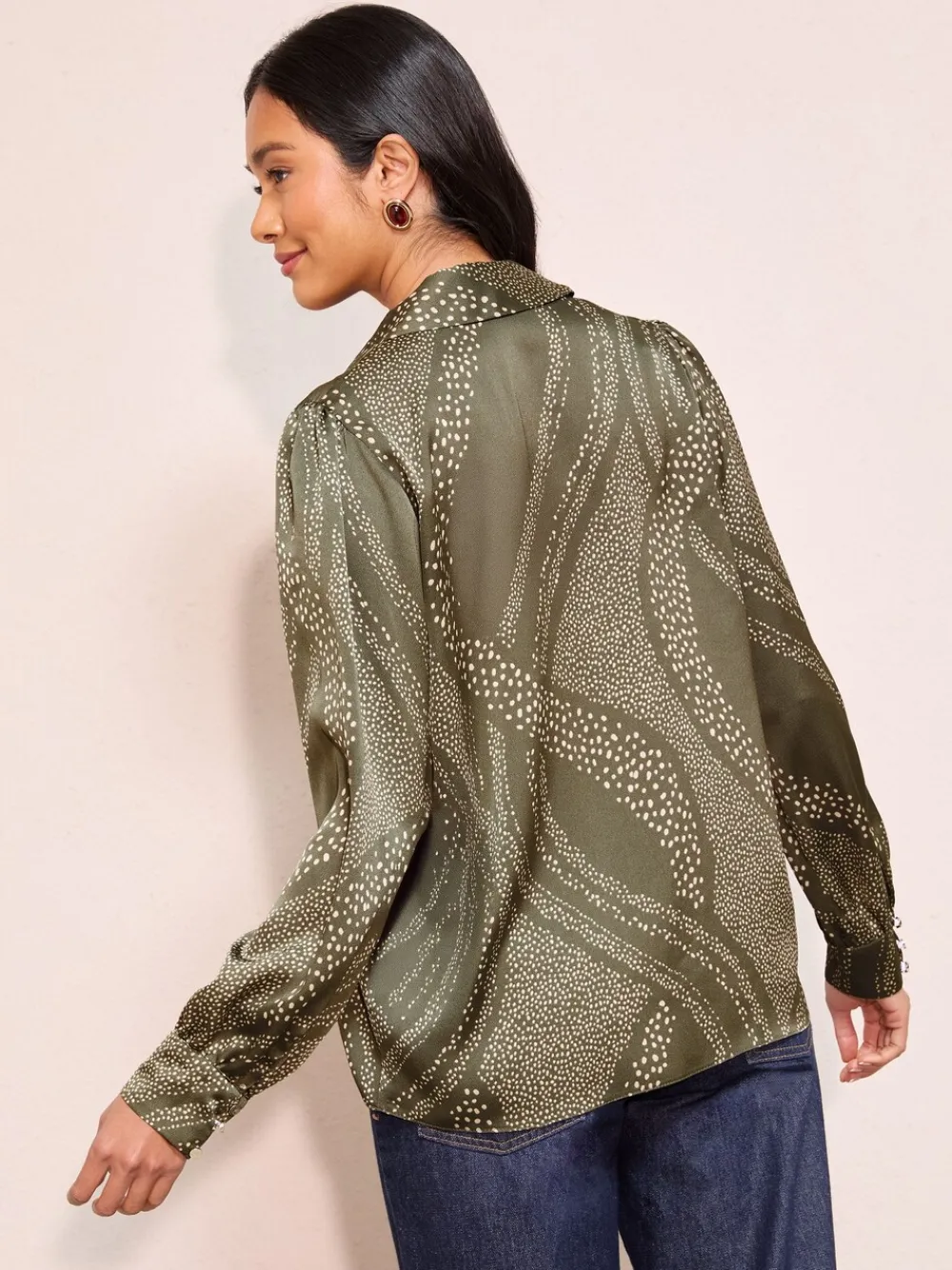 Friends Like These Long Sleeve Button Detail Collared Blouse Khaki Print