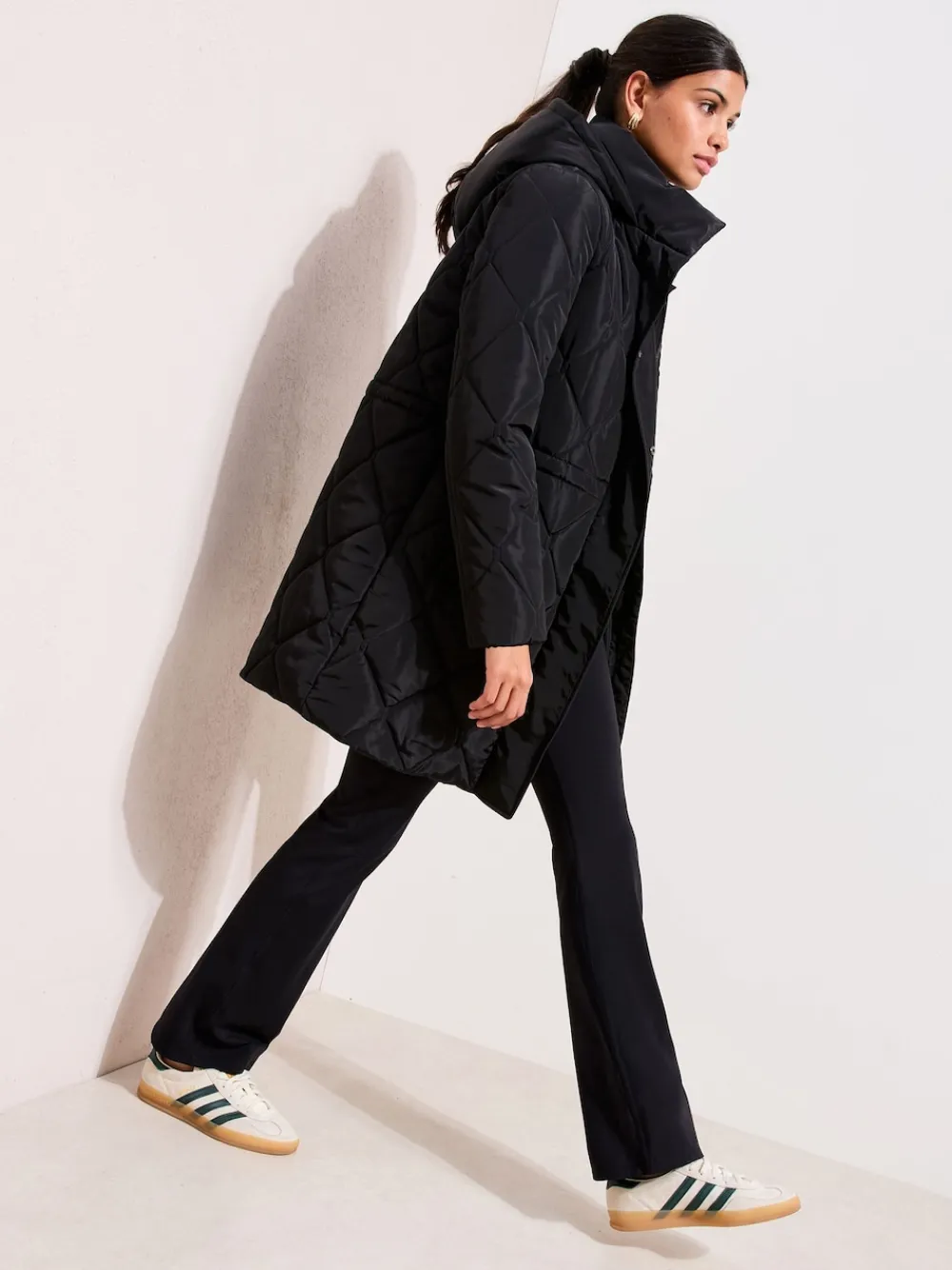Stay warm and stylish this season in this essential padded coat. The mid-length silhouette and internal elasticated fastening offer a flattering fit and extra protection against the cold. Featuring a practical hood and side pockets, this is a timeless winter wardrobe staple. Warm padded design Hood with poppers Internal elasticated fastening Side pockets Main 100% Polyester. Lining 100% Polyester. Wadding 100% Polyester.