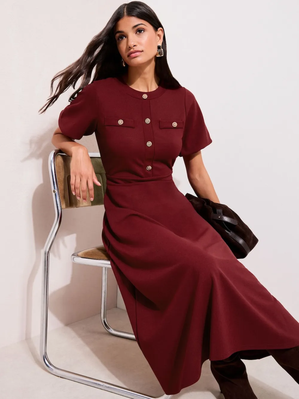 Sophisticated Military Midi Dress, the perfect statement piece for a refined and structured look. Designed with military-inspired details, this dress combines elegance with a touch of ease. Featuring short sleeves, crew neckline and comfortable stretch fabrication. Style it with sleek heels or layer with a tailored jacket for a polished, versatile wardrobe essential. Main 97% Polyester, 3% Elastane. Lining 100% Polyester.