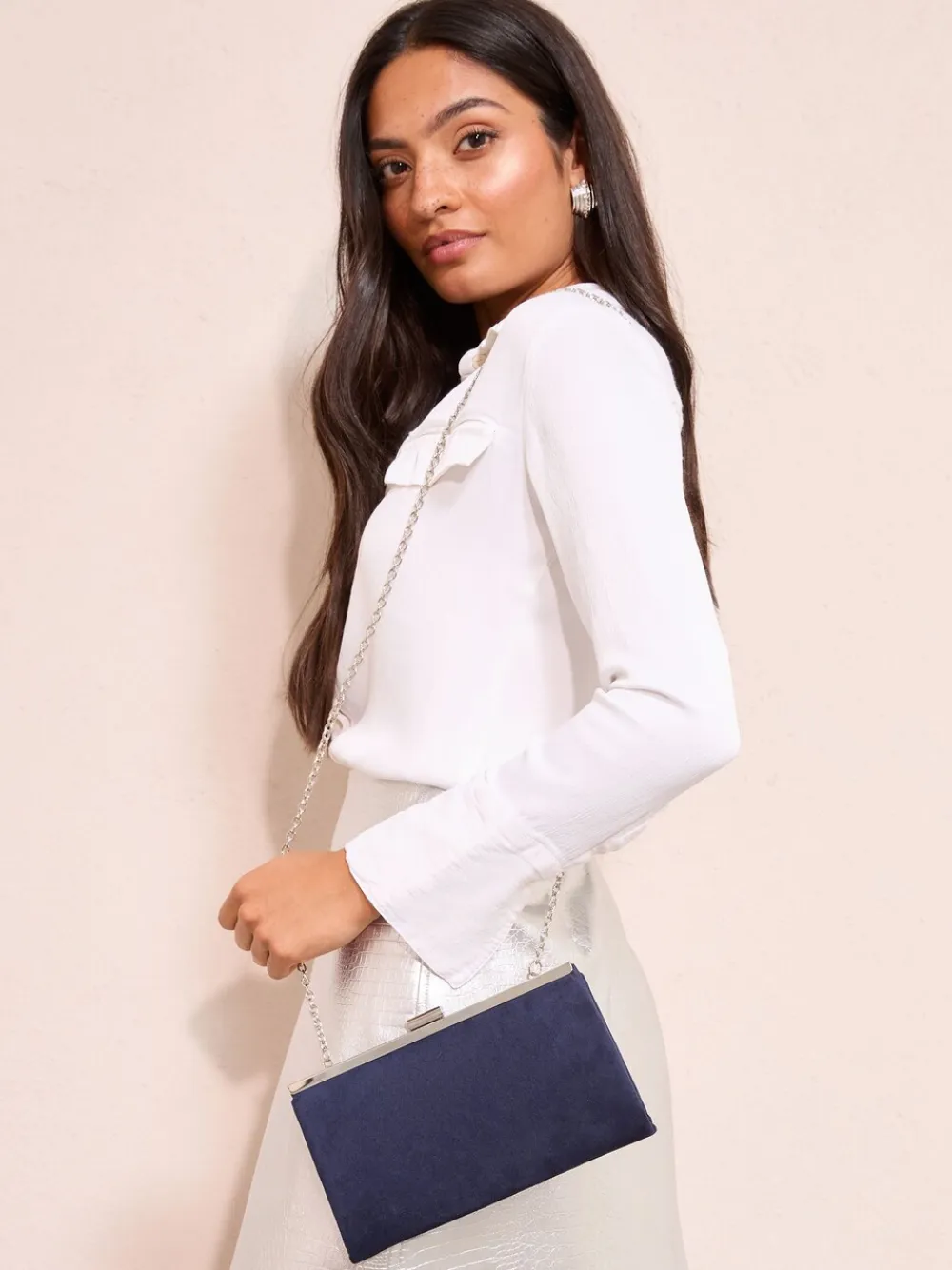Occasion Clutch Bag featuring: gorgeous fabric, secure fastening, detachable chain. A must have staple for your occasion wardrobe. Height 13cm Width 21.5cm Main 95% Polyester, 5% Elastane. Lining 100% Polyester.