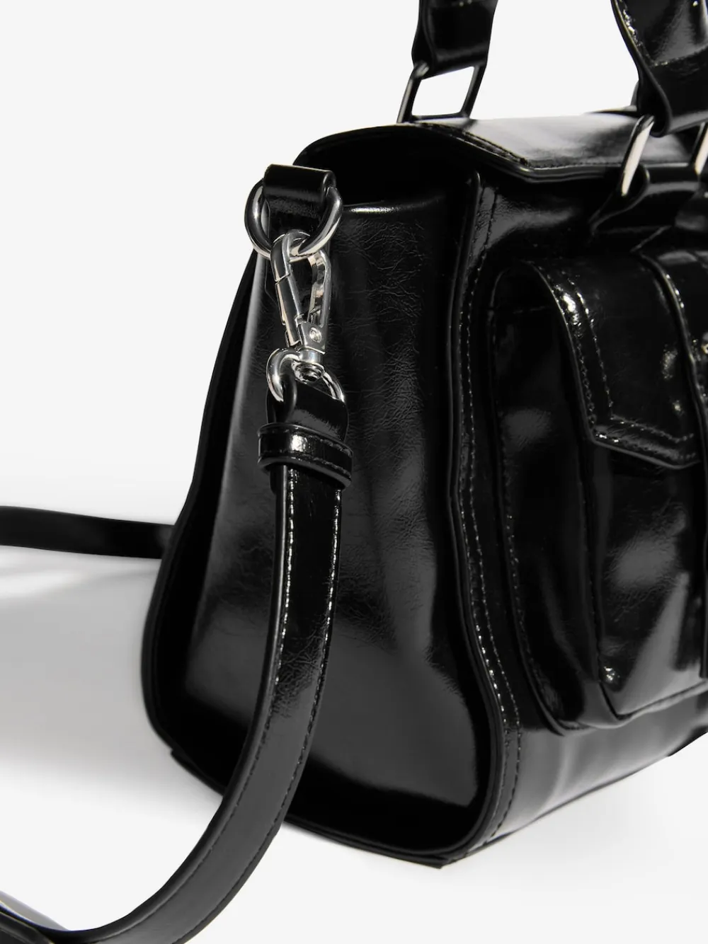 The Friends Like These Padlock Pocket Bag is a stylish and practical faux leather handbag. It features a structured silhouette in a classic black hue. The front is defined by two prominent flap pockets, each adorned with elegant gold-tone padlock charms. The bag includes sturdy top handles and offers secure storage with an inside zip fastening, making it a chic and functional accessory for both everyday use and smart casual outings. Faux leather Pocket detail Padlock charms Height 17cm Width 27cm Depth 11cm Main 100% Polyester with PU coating. Lining 100% Polyester.