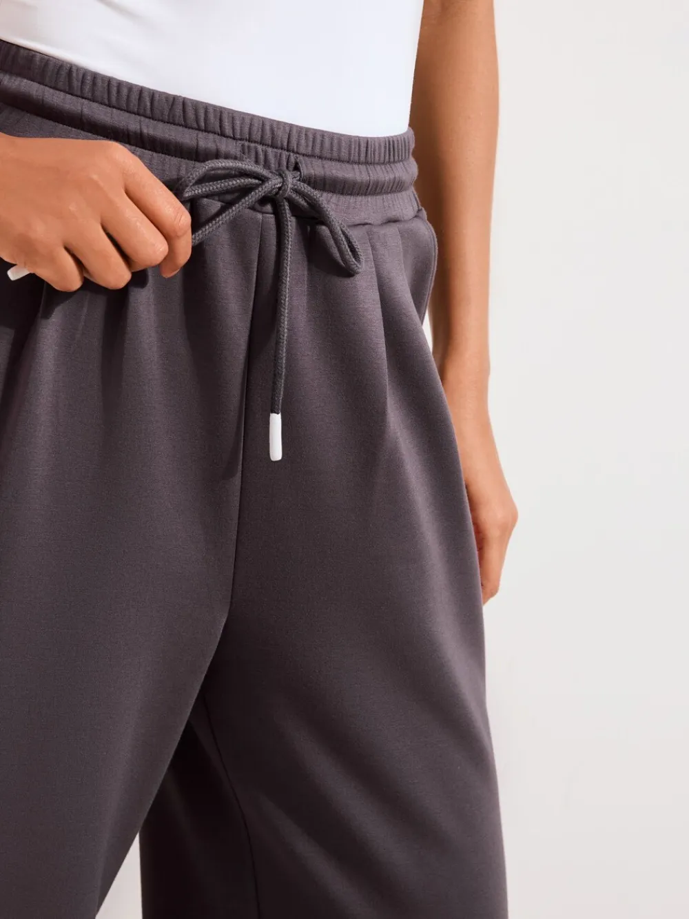 Relaxed-fit wide-leg trousers designed in a soft jersey fabric with pleated detailing down the front. Finished with gently cinched hems for a laid-back yet polished look, they pair perfectly with the matching relaxed tee for workouts, lounging, or everyday wear. Featuring : Relaxed Fit Adjustable Drawstring Side Pockets Pleat Front Detail 50% Polyester, 44% Viscose, 6% Elastane.
