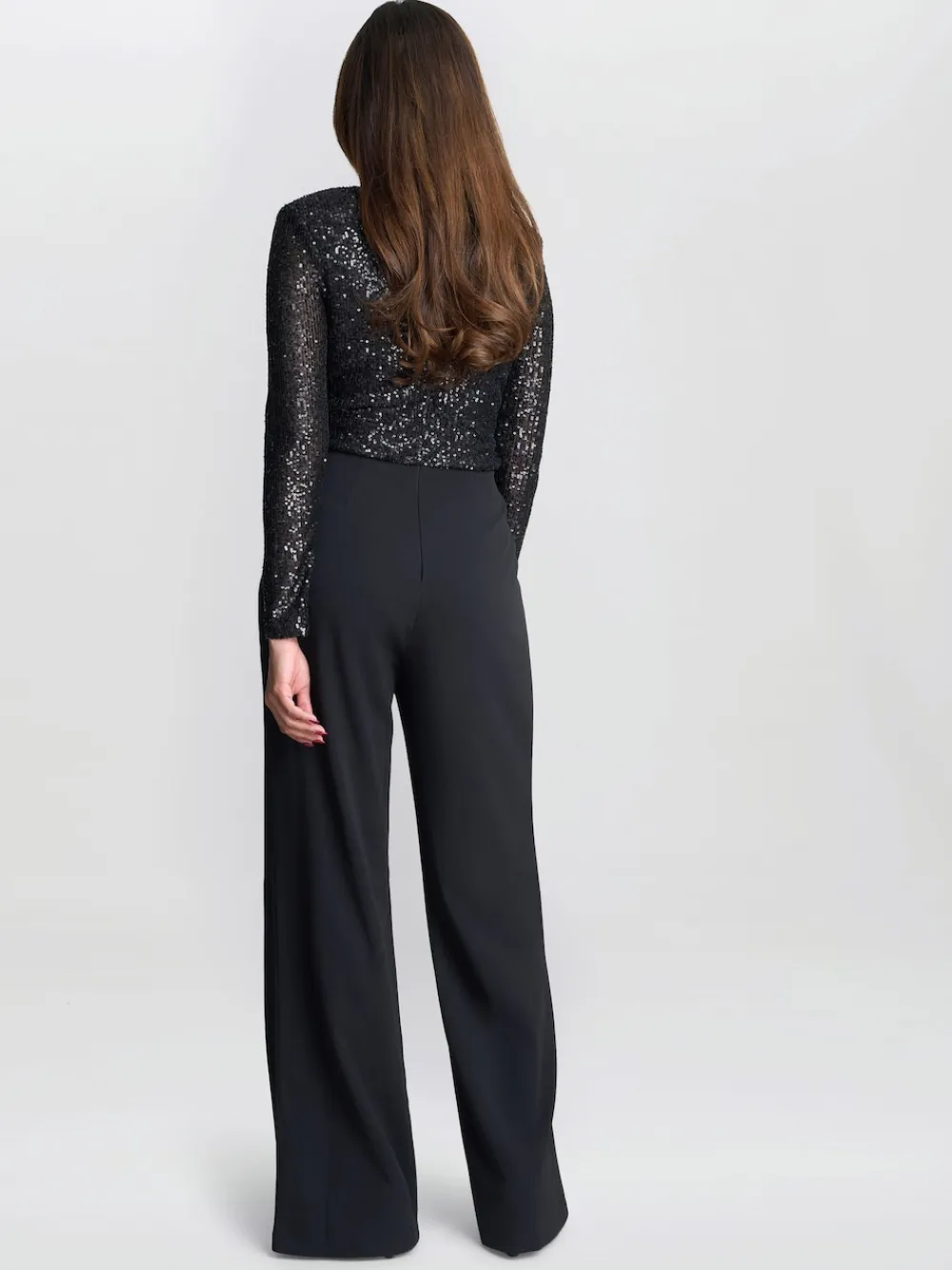 Elevate your eveningwear with the chic Allegra sequin jumpsuit. This sleek black piece features a fitted, long sleeve bodice made from a shimmering black sequin and tailored wide leg trousers that elongated the silhouette. Perfect for cocktail parties. Holiday events, or any special occasions. Measuring 154cm. Regular inside leg length 55″ / 140cm. Wipe clean only. 95% Polyester, 5% Elastane.