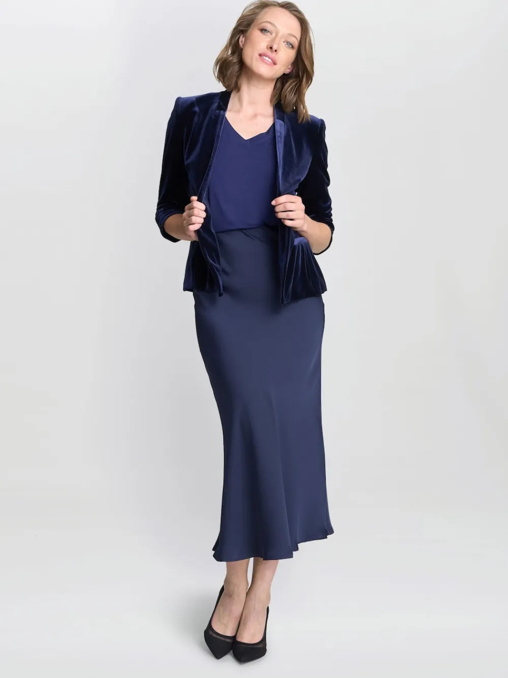A gorgeous layering piece made in a deep blue velvet, this tailored blazer style jacket features a soft structure silhouette with shoulder shaping, an open front and ruched 3/4 sleeves for a modern touch. Regular centre back neck to hem 55″ / 140cm. Dry clean only. 90% Polyester, 10% Elastane.