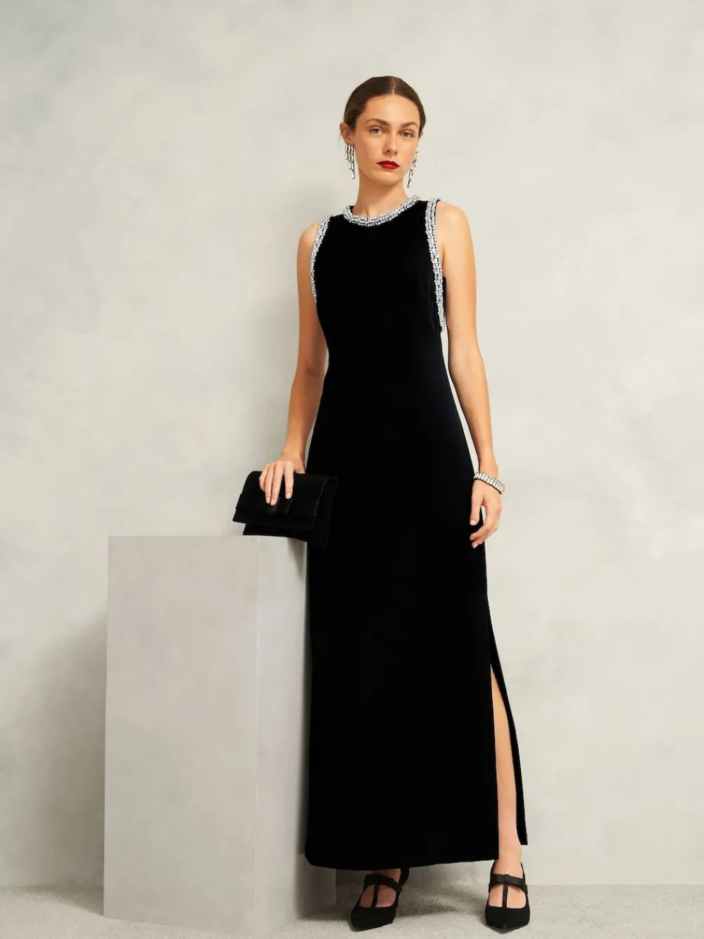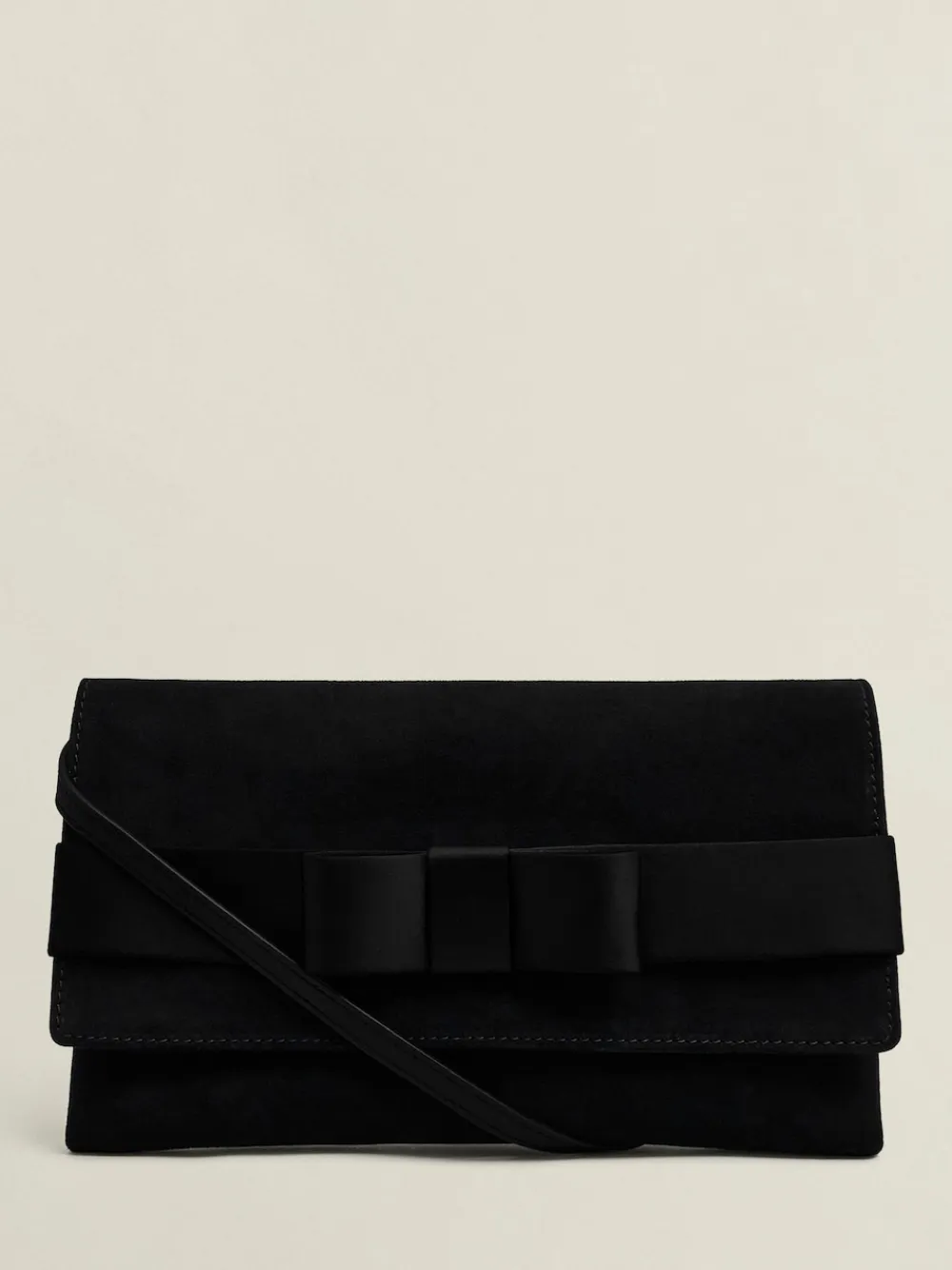 Upcoming gala or end-of-year ball? We’ve reimagined our Renata clutch in luxurious black velvet with a black tie-inspired bow. Soft suede Black tie-inspired bow Classic clutch profile Detachable strap Magnetic closure and internal pocket. Main 100% Suede. Lining 100% Polyester.