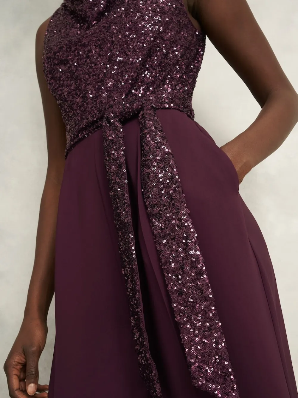 Conversational yet comfortable, the Zuri jumpsuit marries a light-catching sequin bodice with sartorial wide leg trousers. Light-catching sequins. Lined for comfort. Wide leg trousers. Waist tie and side pockets. Elegant cowl neck. Machine washable. Main 100% Polyester. Lining 97% Viscose, 3% Elastane. Main Lining 100% Polyester.