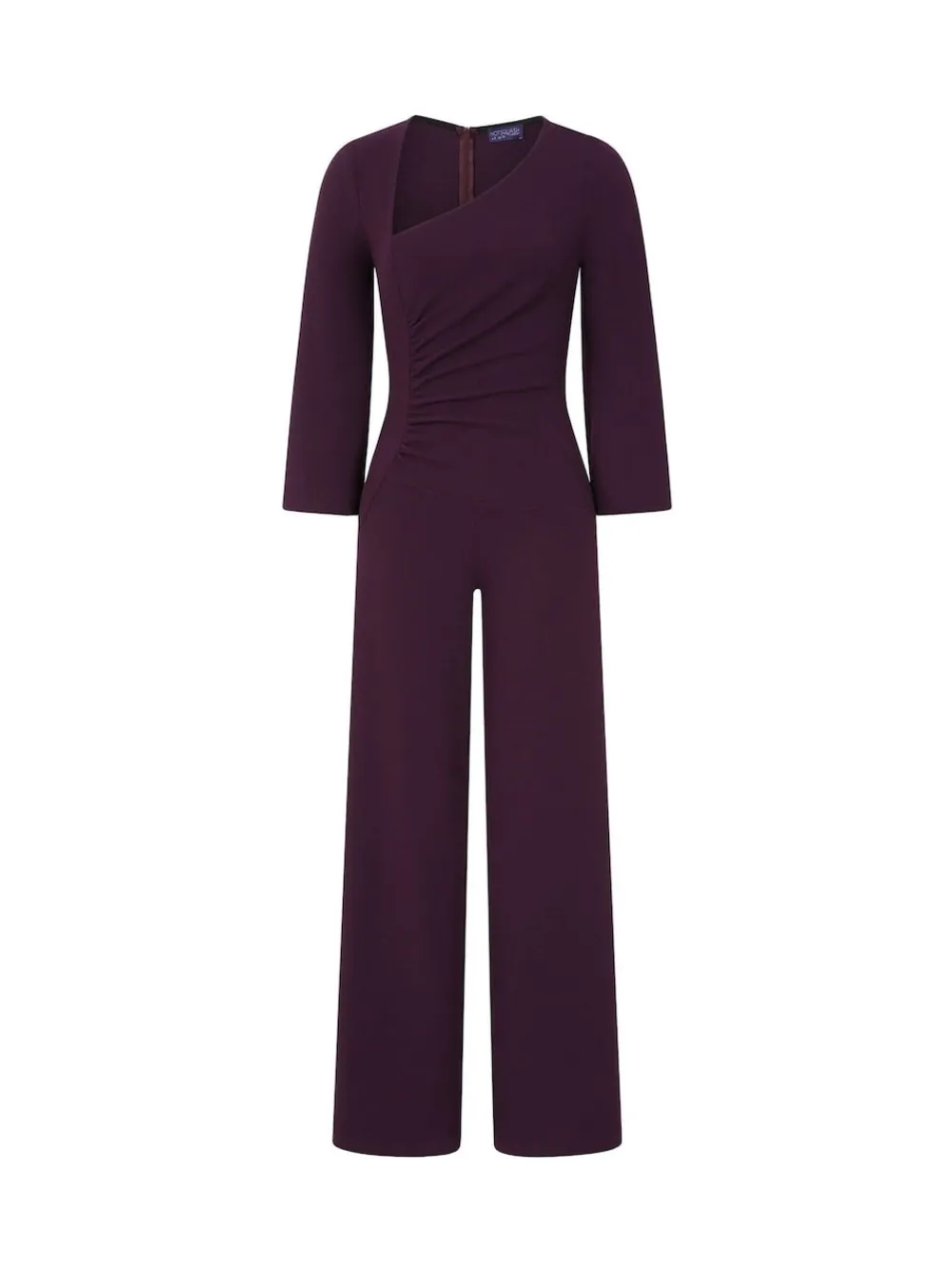 This statement jumpsuit is designed to flatter and flow with every step. Featuring an asymmetric neckline with delicate front ruching, it brings a modern twist to classic elegance. The elasticated sleeves create a soft blouson effect, adding volume and femininity to the silhouette. Cut with wide legs for graceful movement and finished with an invisible zip at the back for a seamless fit, this UK-made piece is the perfect blend of comfort and sophistication. Dress it up for weddings or pair with flats for a more relaxed take—either way, it’s made to be noticed. Machine washable. 95% Polyester, 5% Elastane.