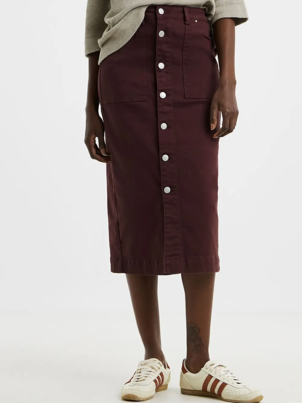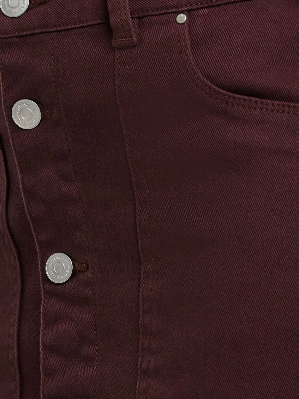 A skirt for all seasons, this burgundy skirt is the perfect everyday denim skirt. Featuring a button through front, flattering midi length, pockets and belt loops. Regular waistband to hem 32″ / 81cm. Machine washable. 98% Cotton, 2% Elastane.