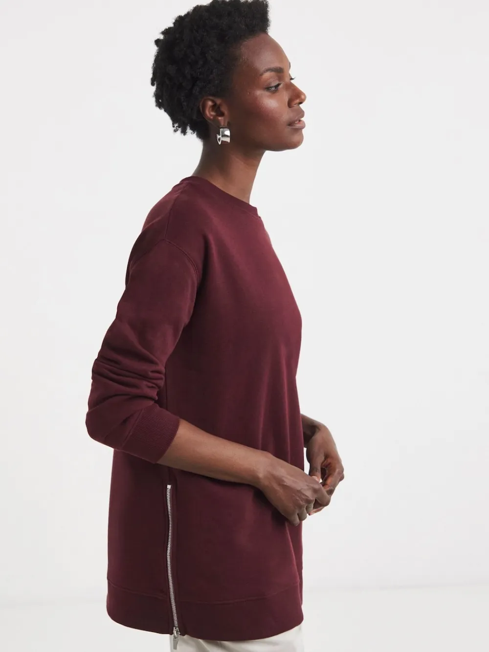Our side zip sweat features a fashionable side zip, and comes in our popular longline shape. Simply pair this sweatshirt with jeans and flats for an elevated everyday look. Machine washable. 50% Cotton, 50% Polyester.