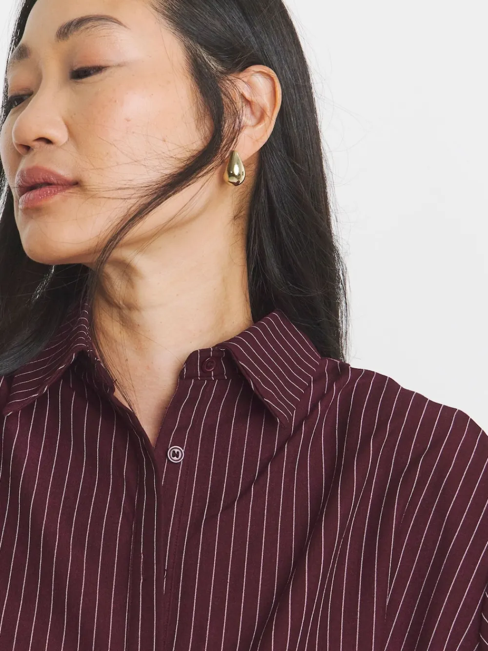 Get the ultimate cool and sophisticated look with our striped twill oversized long sleeve shirt by pairing it with our matching trousers and trainers. Its versatility also means it’ll look great as a separate piece, perfect for desk to dinner and everything in between. Machine washable. 87% Polyester, 10% Viscose, 3% Elastane.