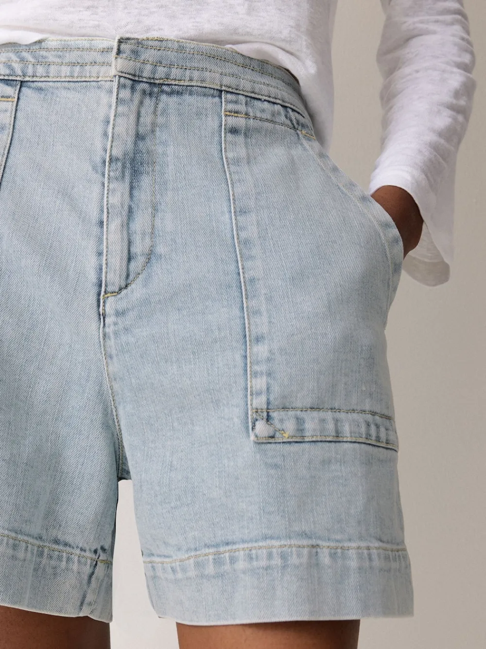 Crafted from pure cotton denim, these high-waisted shorts feature an elasticated waistband for optimal comfort. Front and back patch pockets, along with heavy topstitching details, contribute to both functionality and a distinctive aesthetic. Positioned as the ultimate go-to shorts, their carefully considered length ensures a modest yet versatile appeal suitable for various occasions. Regular inside leg length 15″ / 38.5cm. Machine washable. 99% Cotton, 1% Elastane.