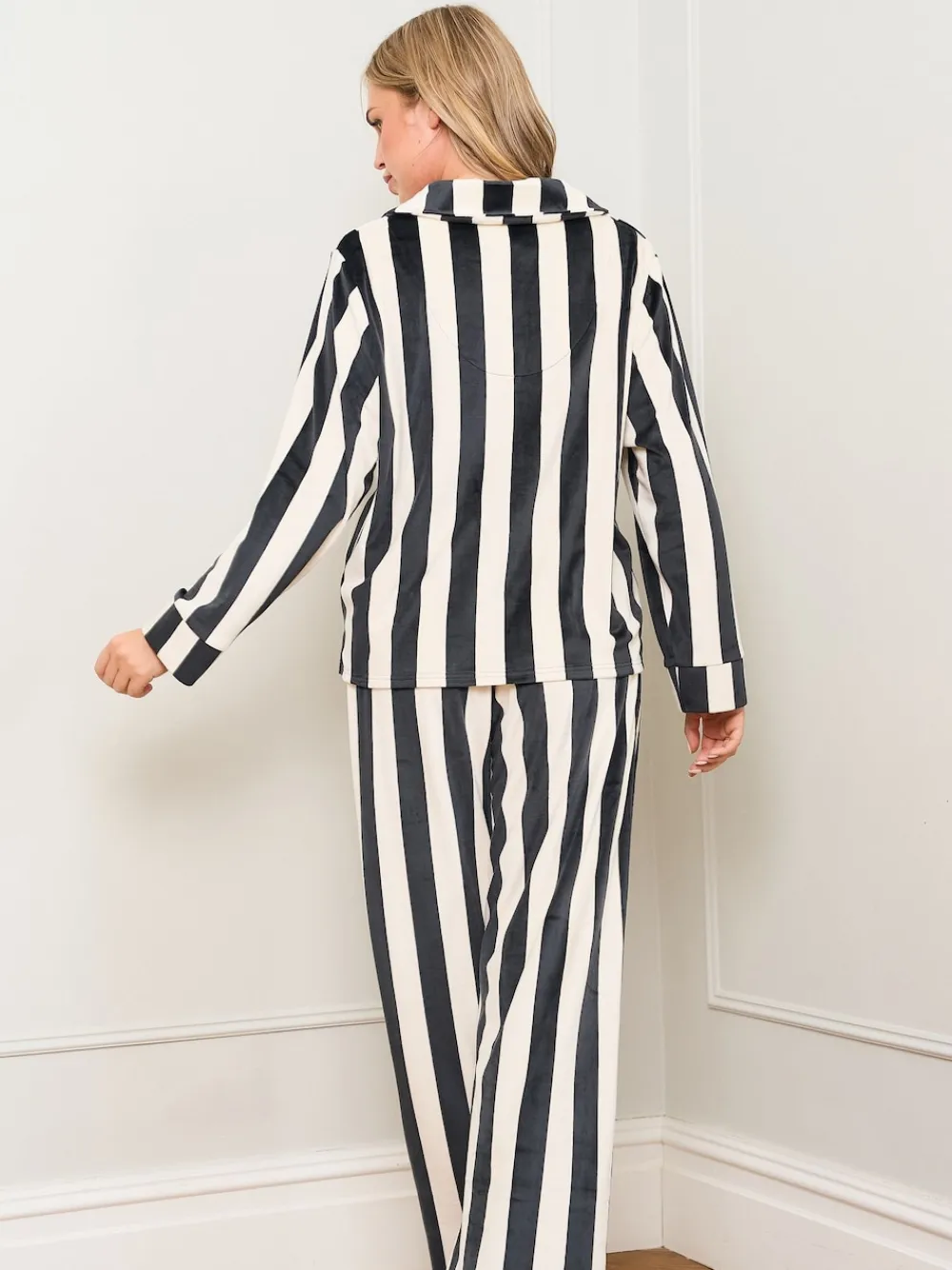 The luxurious pyjama set you all need. This fabric has a beautiful handfeel, perfected with a stylish collar & finished with the satin bows, completing this look. The trousers feature an elasticated waistband and have a loose silhouette, giving the perfect fit for both sleeping or lounging in & the garment has been finished off with tonal satin ties to complete the look. Machine washable. 95% Polyester, 5% Elastane. Warning: Keep away from fire and flames.