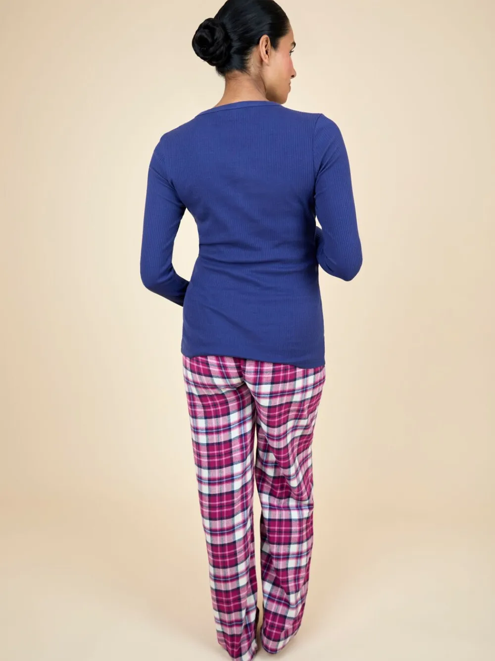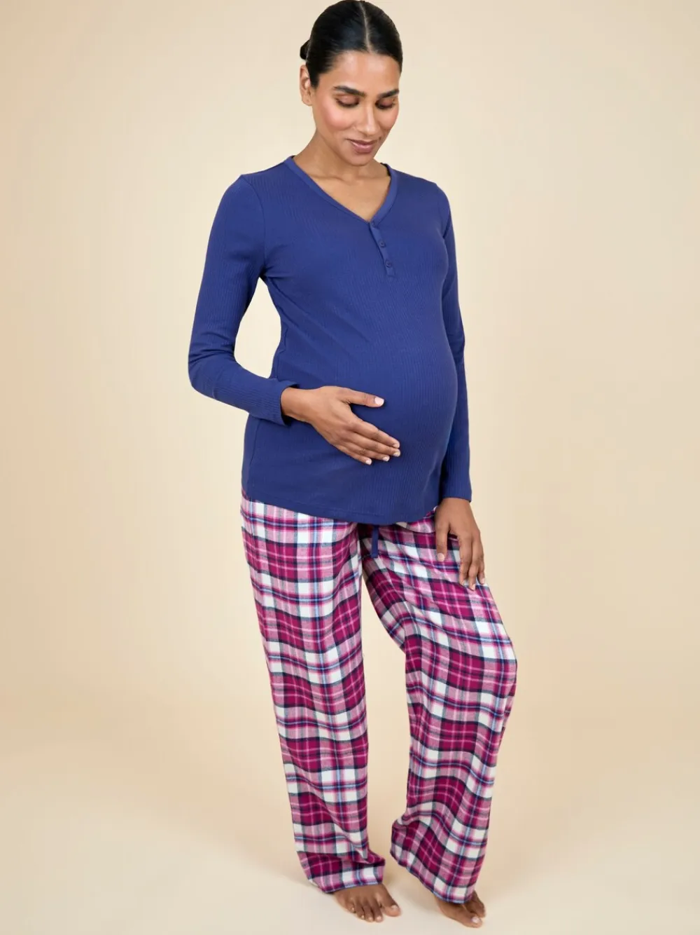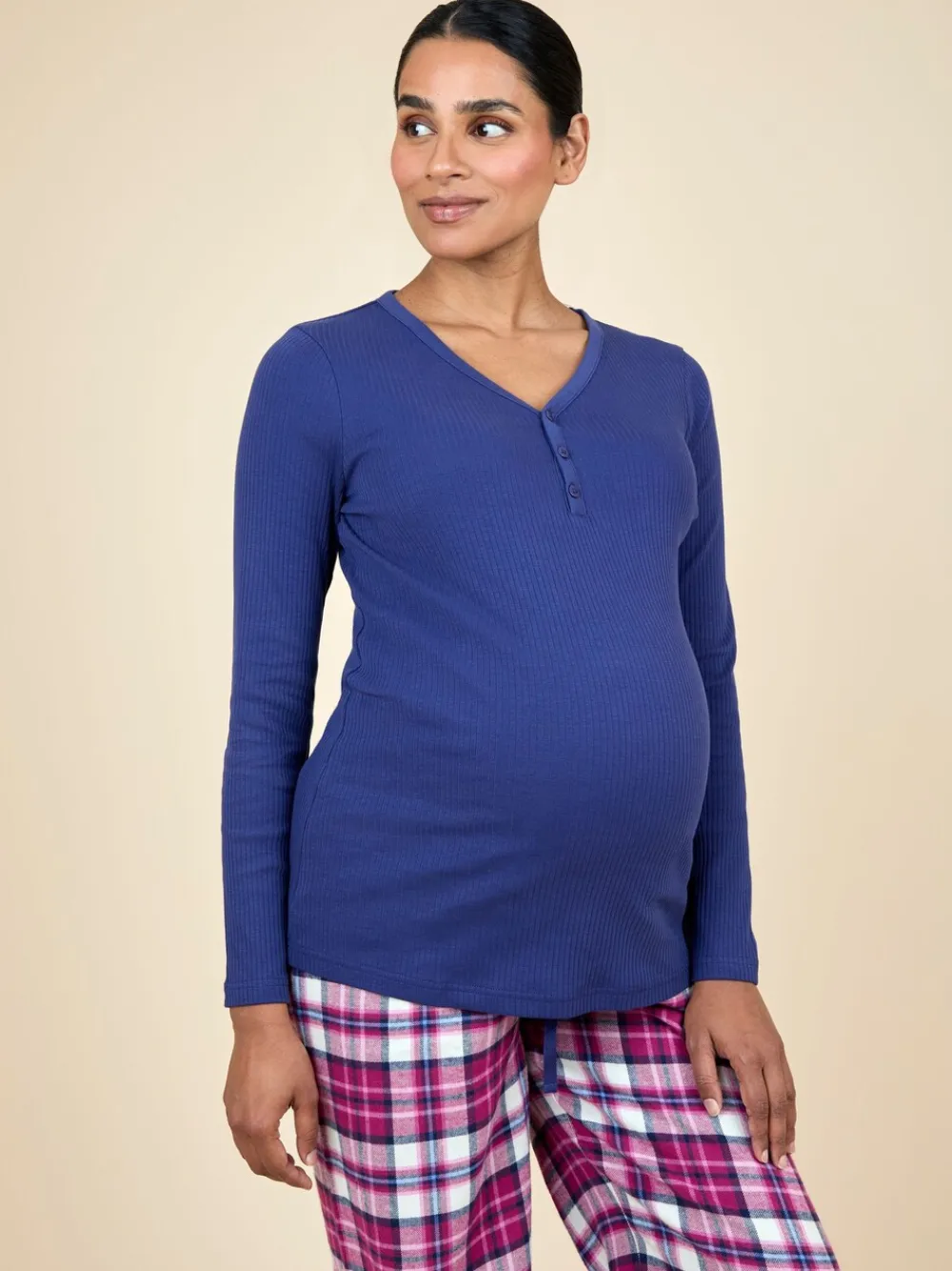 For the winter duvet days, to the relaxed cosy evenings, this Maternity Check pyjama set will have you wrapped up in pillow-like softness you won’t ever want to leave. Featuring a rib-textured navy long sleeve top that will grow with you during your pregnancy, it gently sits over your bump to help you towards a good nights sleep while the tartan check trousers come with a layer to fit over your bump and a drawstring waist to adjust and bring you blissful comfort all night long thanks to the soft, breathable fabric. Designed to fit during and after pregnancy The set includes pyjamas top and bottoms Navy ribbed texture top Half button scoop neck Wide jersey waistband to wear over the bump Side pockets Drawstring at waist Machine washable Model is 170cm (5’7”) and wears a size S. Top 98% Cotton, 2% Elastane. Bottom 100% Cotton.