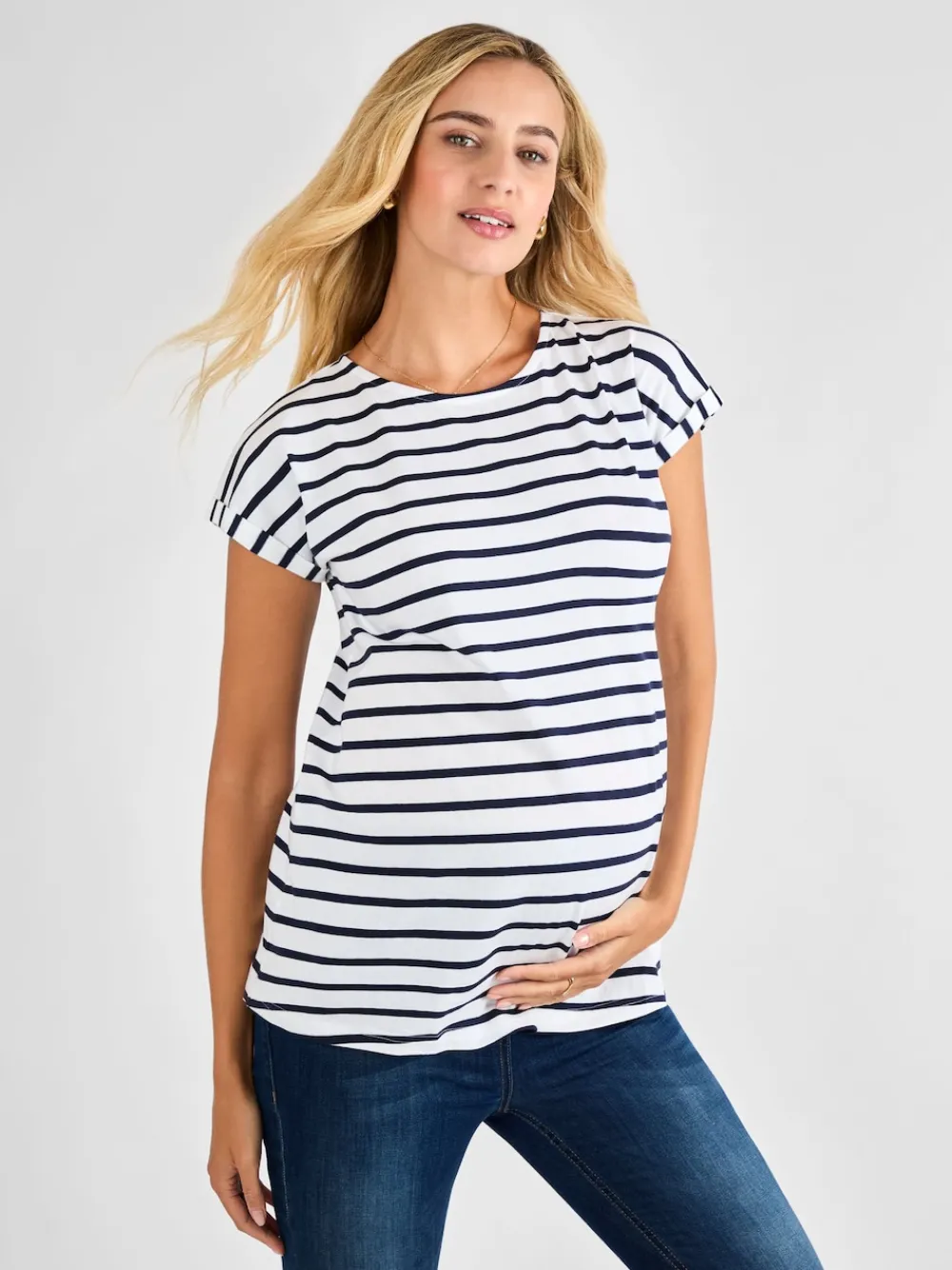 You can never have too many great basics. Our quality White and Navy Stripe Boyfriend Cotton Maternity T-Shirt is the ultimate everyday piece that keeps your style feeling like you, just with a little more room to grow. The relaxed boyfriend fit, round neckline, and short sleeves with turn-back cuffs make it a go-to for every trimester. Pair it with your favourite maternity jeans, soft trousers, shorts, or layer it under dungarees – it’s the perfect starting point for countless comfy, effortless looks. Designed to fit throughout pregnancy White and navy stripes Relaxed jersey fit for growing bump Round neck Short sleeves with turn-back cuffs Machine washable Machine washable. 100% Cotton.
