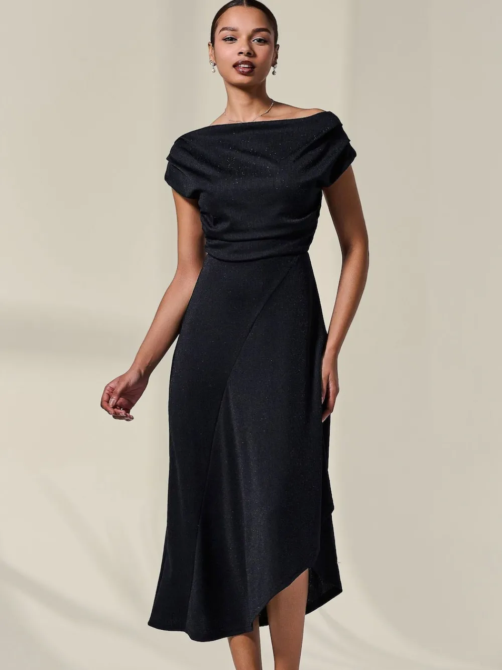 Sophisticated and elegant, the Asymmetric Draped Midi Dress by Jolie Moi will make you feel your best, with its floaty silhouette and unique pleated neckline, which can be worn in multiple ways, whether that be off the shoulder or as a more cowl neck style. Its asymmetric wrap hem adds an element of fun to this stylish piece, whilst the length keeps in classy. The shimmers in the fabric would make this dress the perfect evening piece, whilst also being comfortable. This over the head style is also fully lined with the softest jersey material for added comfort, so you can dance the night away. Models’ height- 176cm and wears a size 8, length- 124cm Machine washable. 72% Polyester, 24% Other fibres, 4% Elastane.