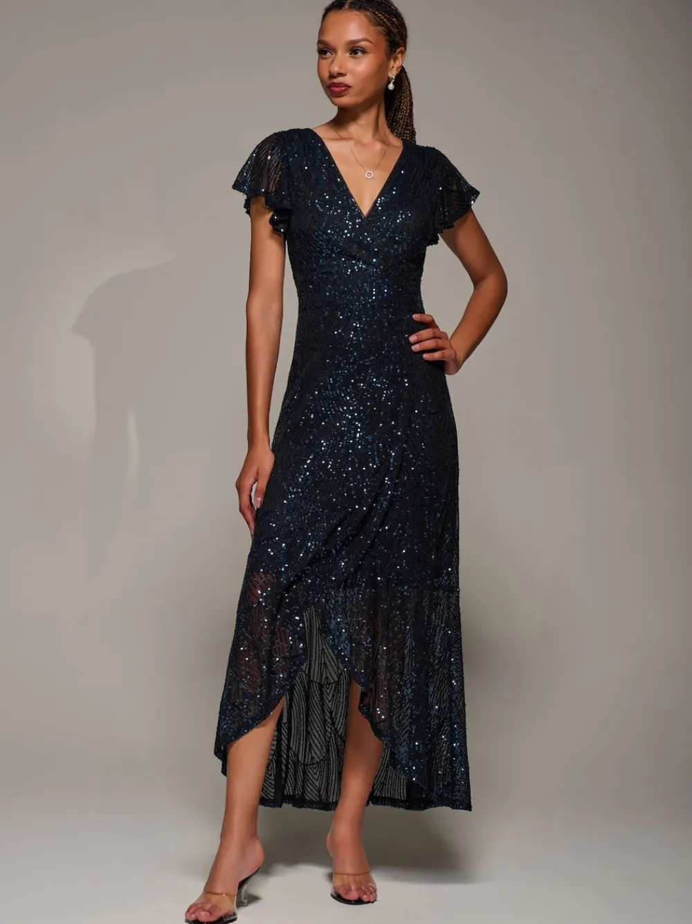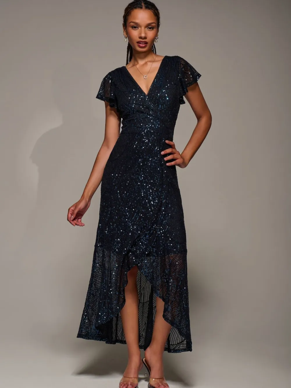 Frill Short Sleeve Sequin Maxi Dress by Jolie Moi features a wrap-style bodice with a V neckline and short frill sleeves, paired with a matching wrap skirt that falls into an elegant asymmetric hem. The fitted waistband flatters the figure, while a concealed back zip offers a smooth finish. A cascading frill from waist to hem adds graceful movement to complete the look. Model is 170cm and wears a size 8. Length: 138cm. Machine washable. 100% Polyester.
