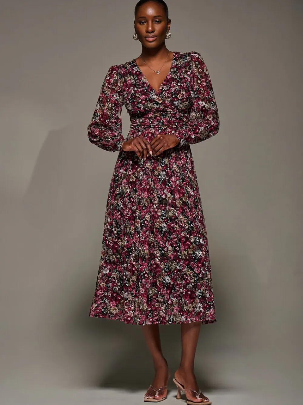 Long Sleeve Printed Lace Maxi Dress by Jolie Moi features a wrap-style front with a flattering V-Neckline, long sleeves finished with cuffs, and a subtly gathered side waistband that creates a graceful draped effect. The pleats at the waist add gentle volume to the skirt, and a concealed zip at the back ensures a seamless look. Machine washable. 93% Nylon, 7% Elastane.