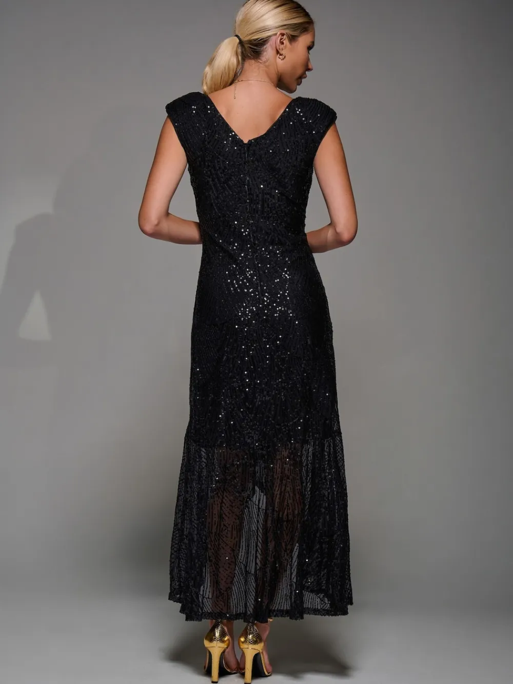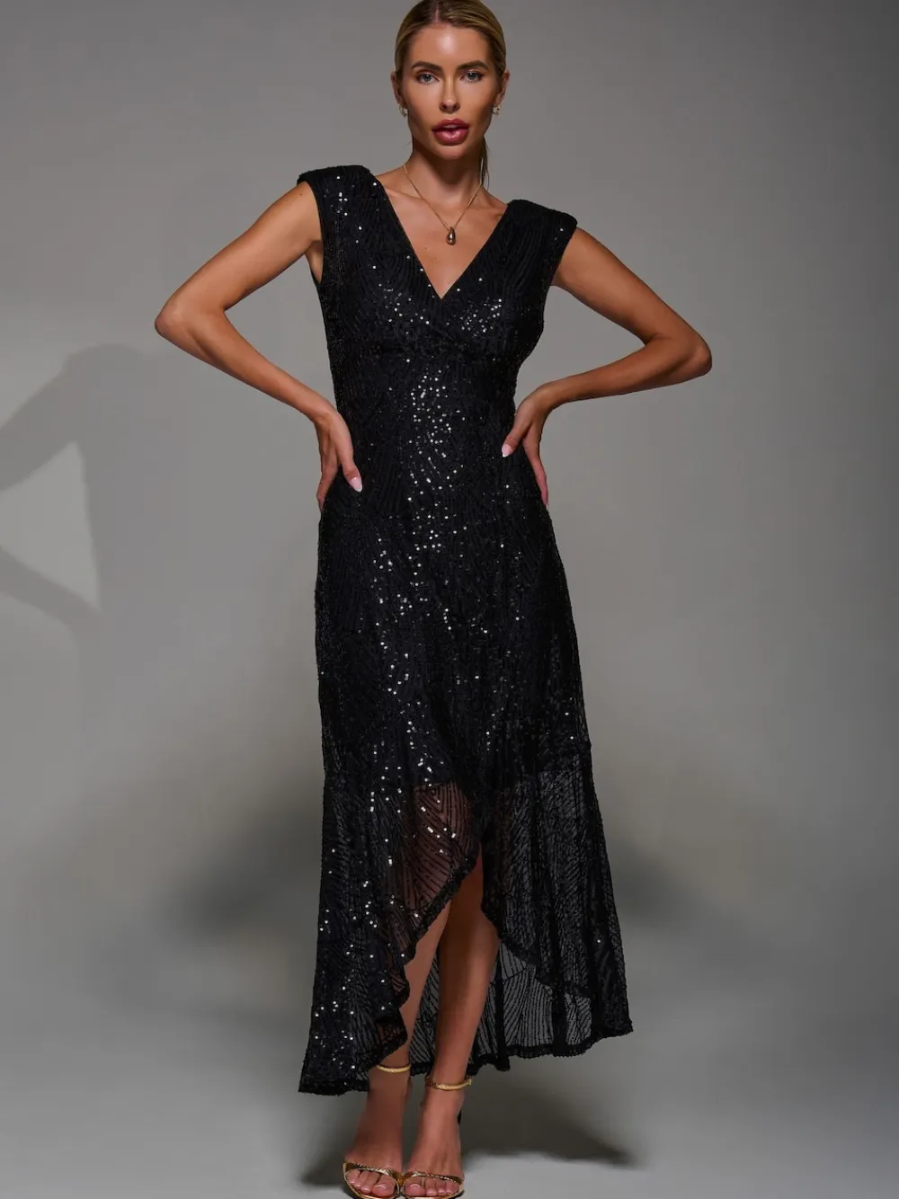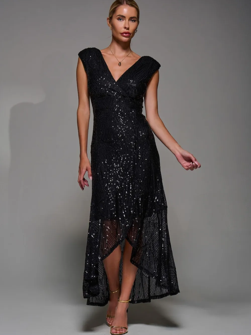 Be the first to review “Jolie Moi Black Sequin Asymmetric Ruffle Hem Maxi Dress Clearance” Cancel reply