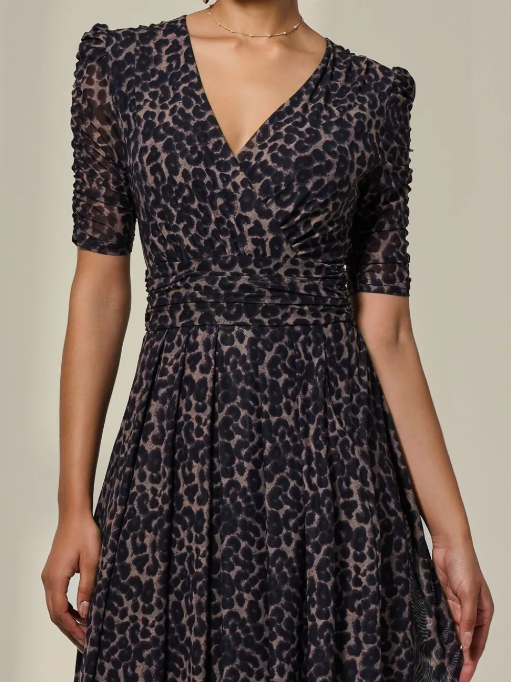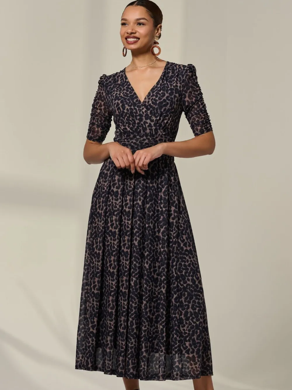 Our Ruched Sleeve Mesh Dress by Jolie Moi will make you feel fabulous, adorned in a chic animal print layered over the softest mesh fabric, which is fully lined for the perfect balance of comfort and sophistication. The ruched mesh sleeves with shoulder ruffle detailing make this dress extremely flattering, as well as the thick ruched waistband for that cinched-in look. It’s an over-the-head style with discreet side from pockets, adding practicality to this elegant piece, which also has a soft pleated skirt which falls perfectly at a midmaxi length, and a faux wrap v neckline. Model’s height- 176cm and wears a size 8, length- 133cm. Machine washable. 95% Polyester, 5% Elastane.