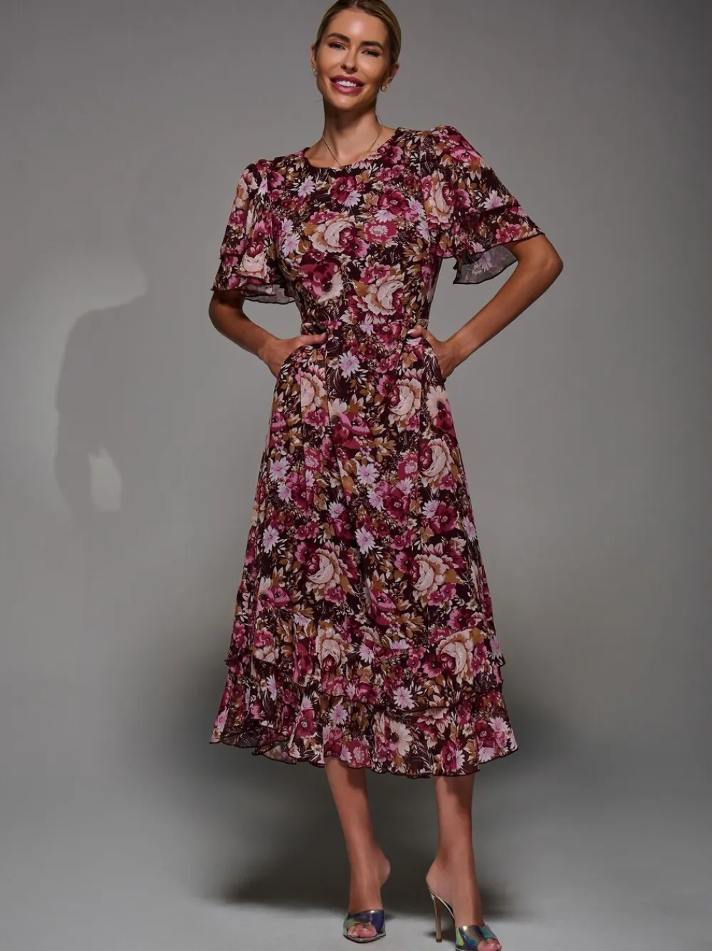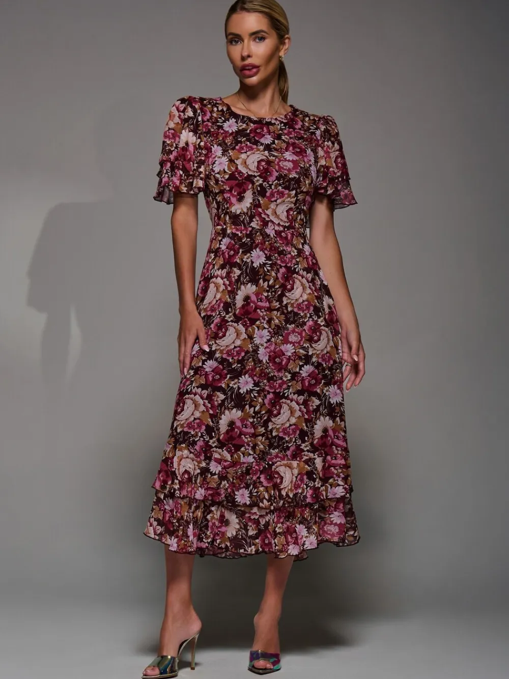 The Frill Detail Chiffon Midaxi Dress by Jolie Moi features a round neckline, a flattering tie waist, and a concealed zip at the back. Soft, 2-layer short flowy sleeves and a double-frilled hem add a graceful, romantic touch. Finished with practical side pockets, it’s a versatile piece perfect for both day and evening occasions. Model’s height- 170cm, and wears size 8, length 126cm. Machine washable. 100% Polyester.