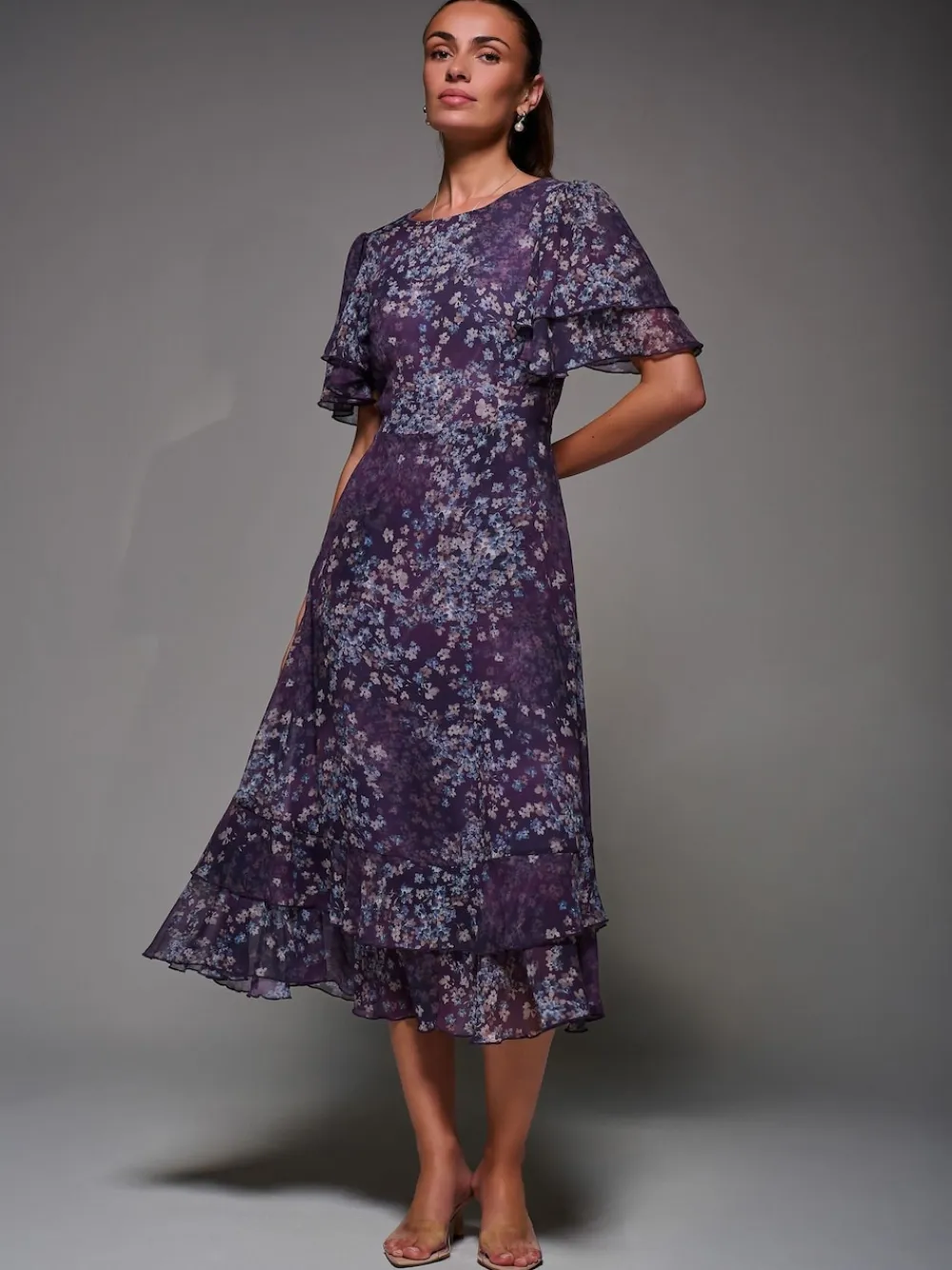 The Frill Detail Chiffon Midaxi Dress by Jolie Moi features a flowing two-tier frill maxi skirt and delicate short frill sleeves. Made from lightweight chiffon, it has a round neckline and a concealed zip for a seamless finish. The dress is fully lined for comfort and includes practical side pockets. A tie detail at the back cinches the waist for a flattering shape. Machine washable. 100% Polyester.