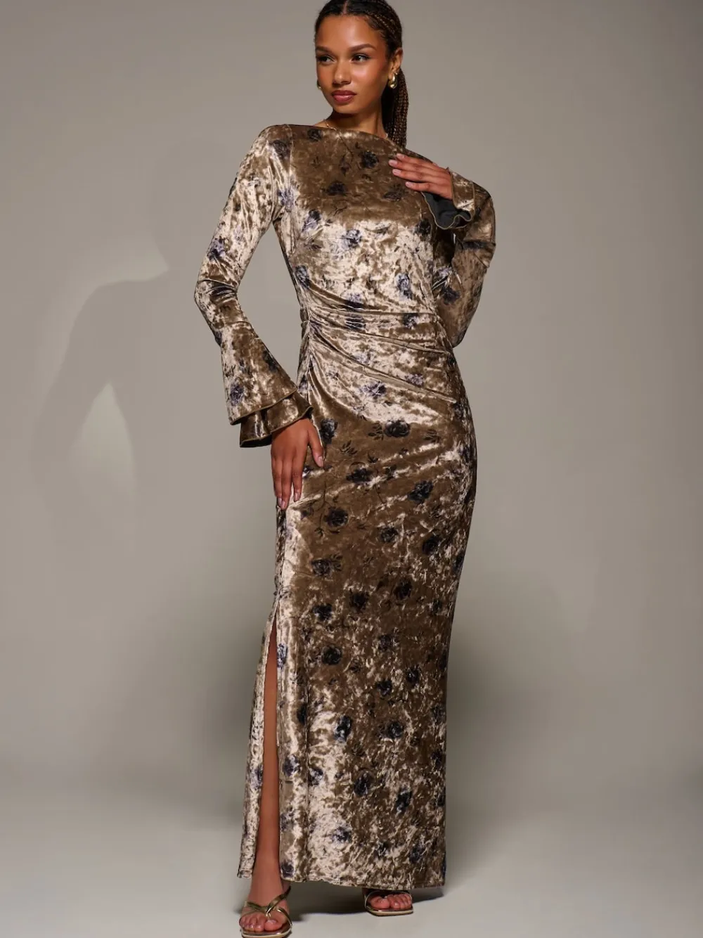 Be the first to review “Jolie Moi Gold Ruffle Sleeve Asymmetric Neck Velvet Maxi Dress Sale” Cancel reply