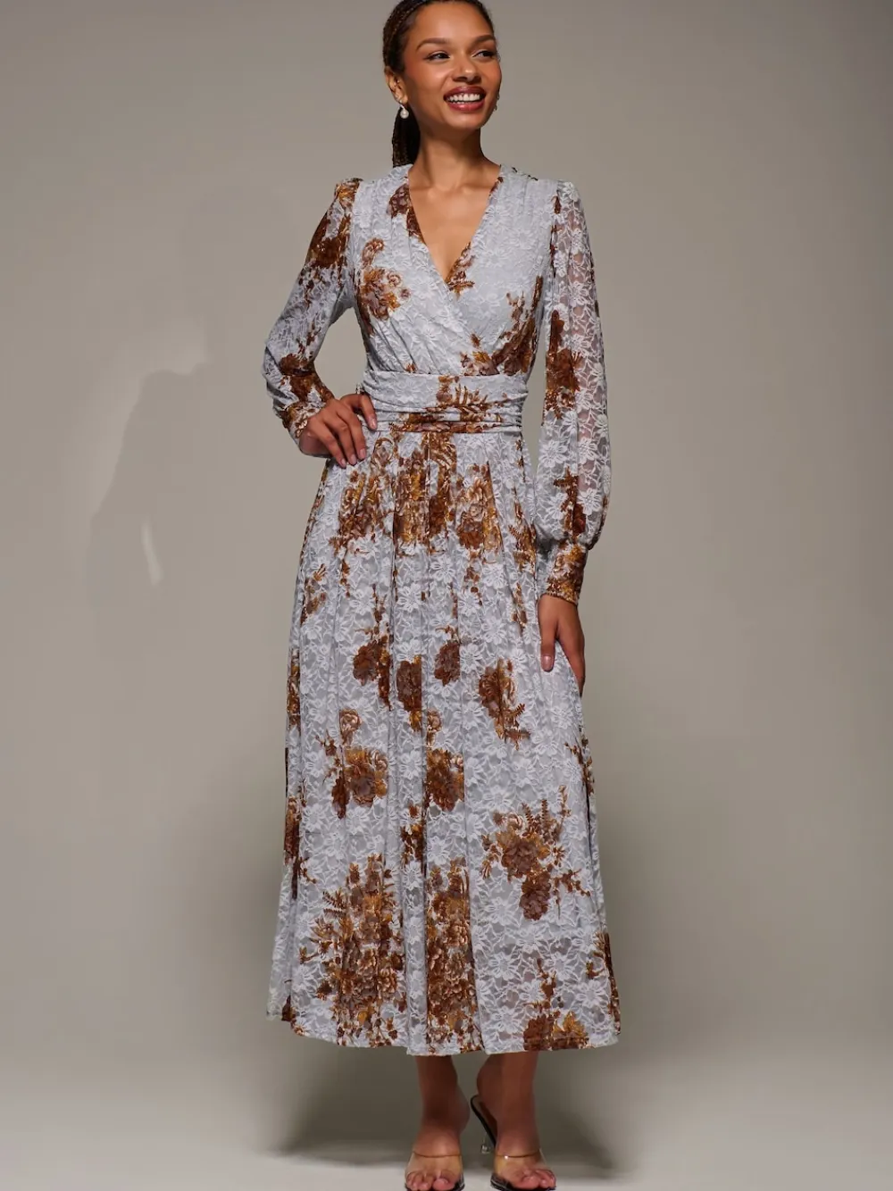 The Long Sleeve Printed Lace Midaxi Dress by Jolie Moi features an elegant V-neckline and cuffed long sleeves. Made from delicate lace, it falls to a flattering Midaxi length. Fully lined, the dress has a thick waistband that defines the waist, with a tie detail at the back for added shape and fit. Machine washable. 92% Nylon, 8% Elastane.