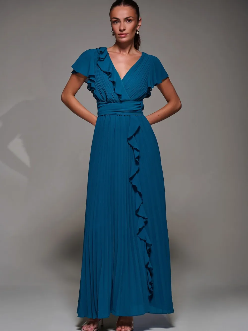 The Pleated Frill Detail Chiffon Maxi Dress by Jolie Moi is made from delicate chiffon and fully lined for comfort. It features frill short sleeves and a frill crossover neckline that extends down the back of the dress. The skirt is pleated for graceful movement, and a tie detail at the back adds a finishing touch. Machine washable. 100% Polyester.